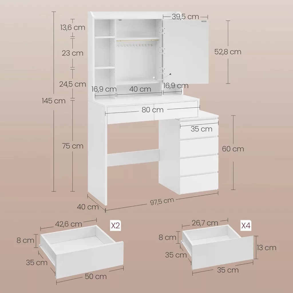 A praktikusan kialakított tárolórendszer - 7 nyitott rekesz, 2 nagy fiók, tükör mögötti polcok és akasztók, valamint egy 4 fiókos szekrény - rendszerezett helyet biztosít minden szépségápolási terméknek és kiegészítőnek.