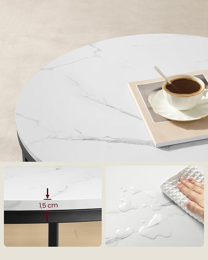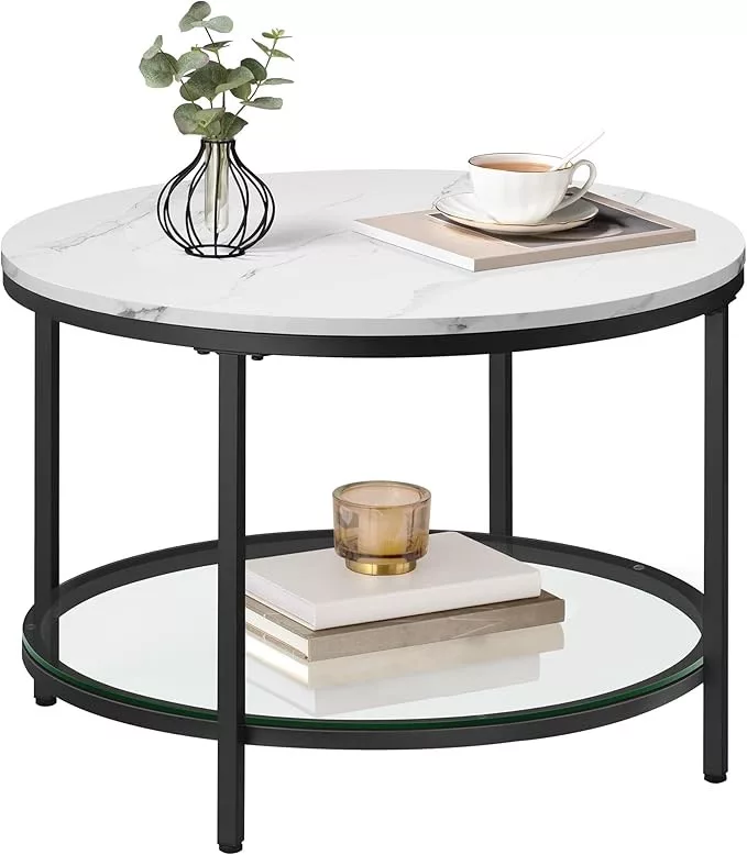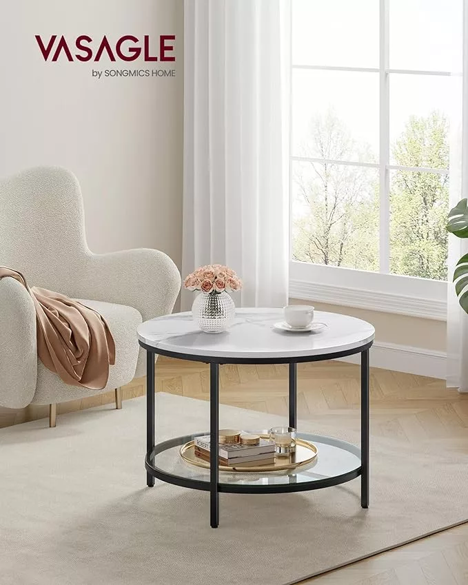 VASAGLE Modern Márvány Dohányzóasztal Üvegpolccal Fehér-Fekete