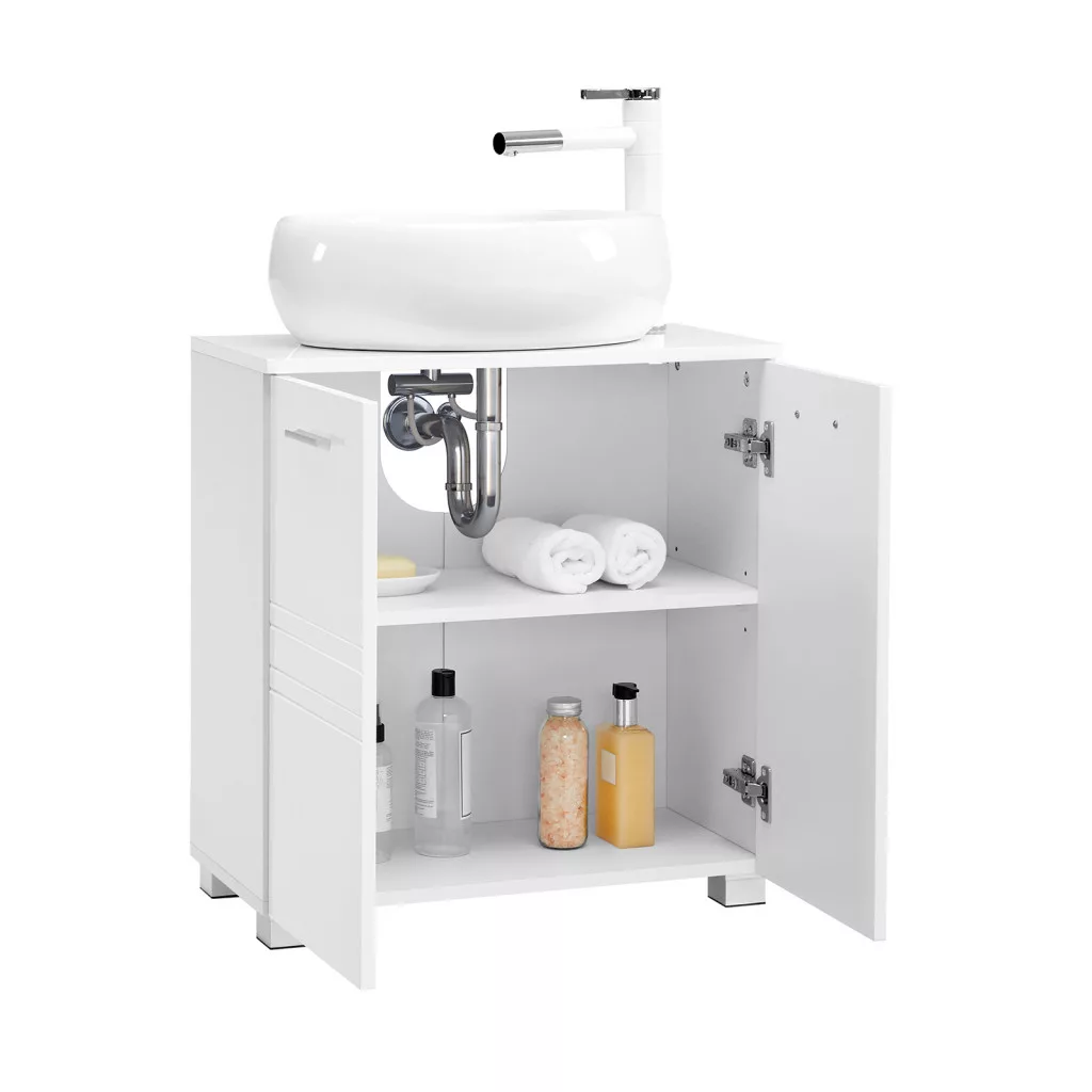 Elegáns fehér fürdőszobai szekrény állítható polccal és két ajtóval, amely tökéletes megoldást nyújt a mosdó alatti tároláshoz és rendszerezéshez.