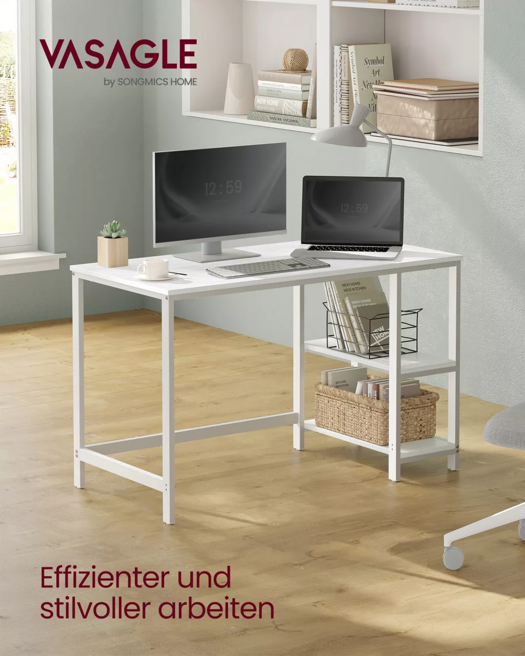 VASAGLE Modern Számítógépasztal Juharfehér Acélvázzal és Polcrendszerrel