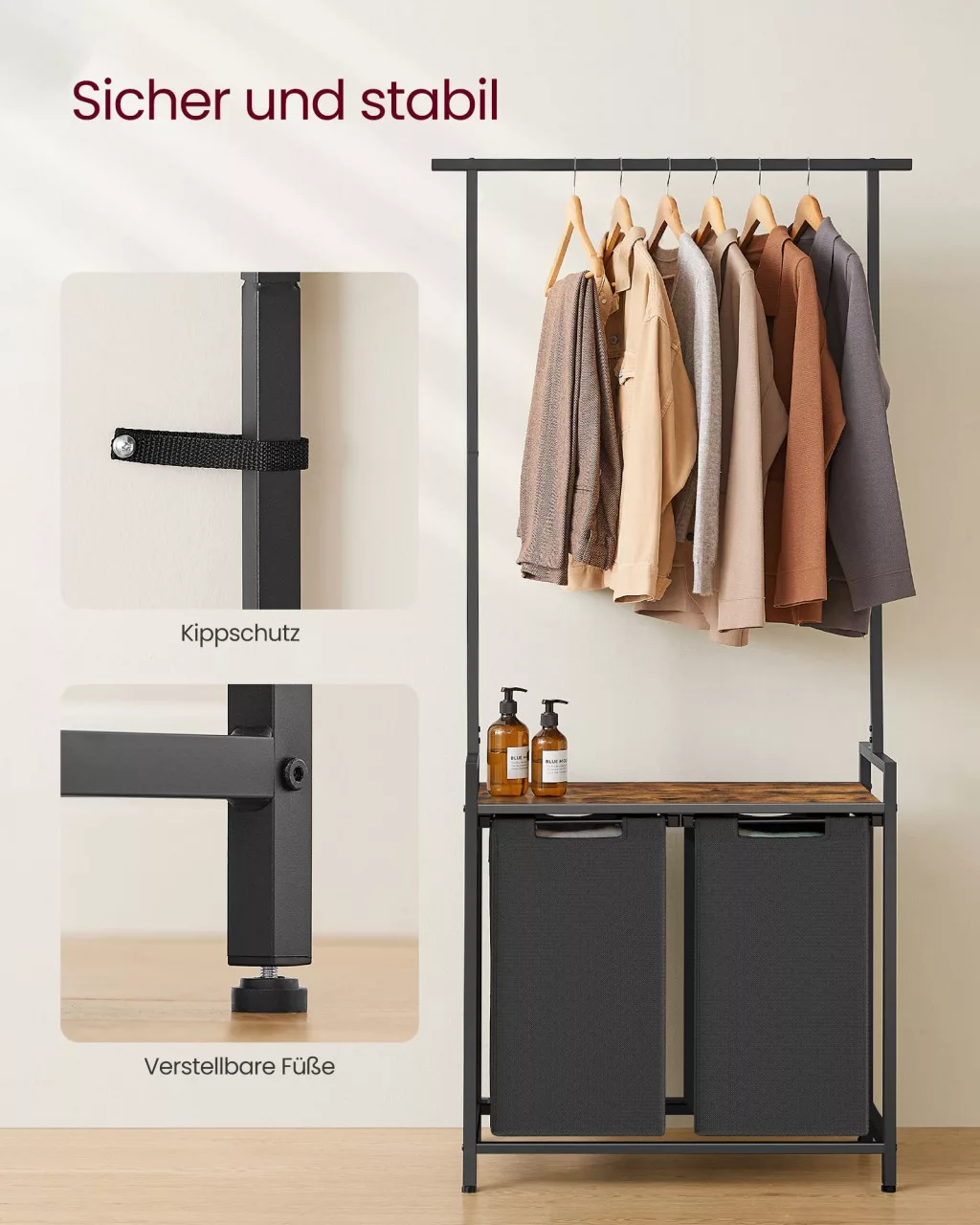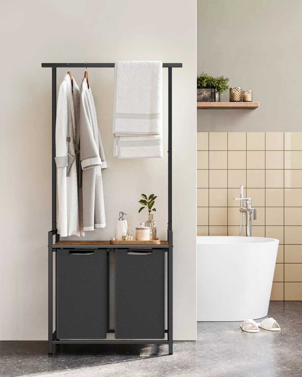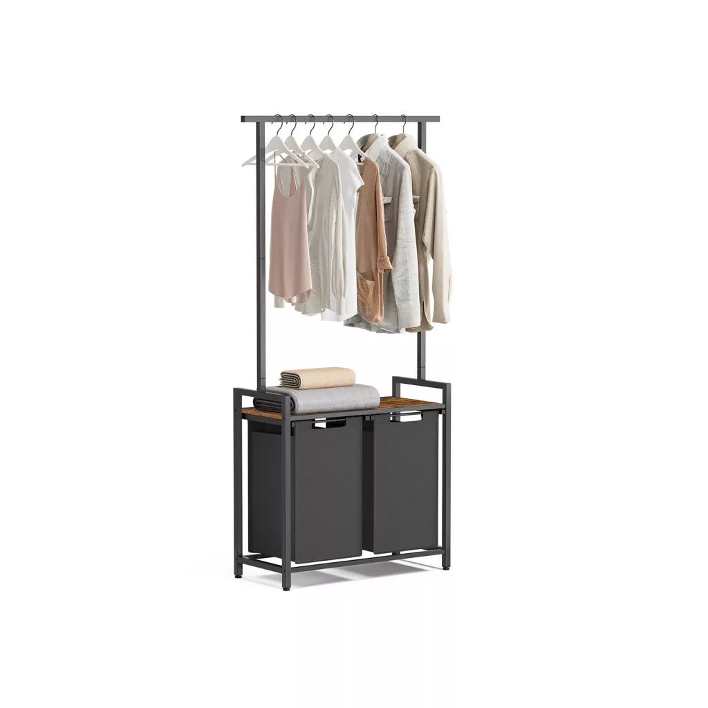 VASAGLE Modern Szennyestartó Állvány Polccal és Akasztóval Rusztikus Barna-Fekete