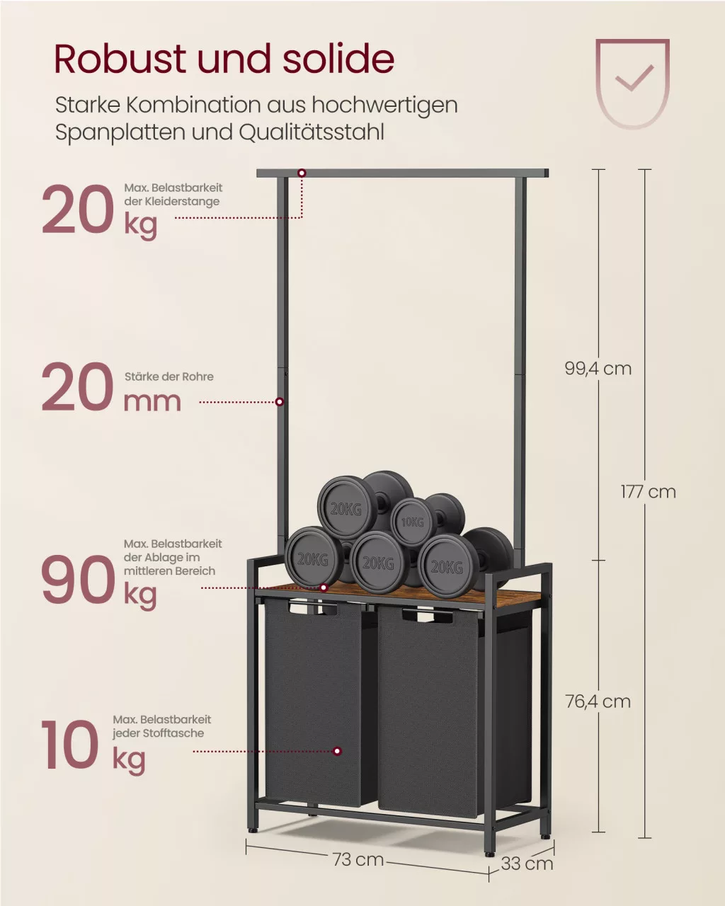 Ez a modern VASAGLE szennyestartó állvány egyesíti a praktikumot az esztétikummal. A két kivehető, vízlepergető kosár összesen 92 literes kapacitással rendelkezik, míg a felső polc és akasztórúd további tárolási lehetőséget biztosít a tiszta ruhák és mosodai kellékek számára.