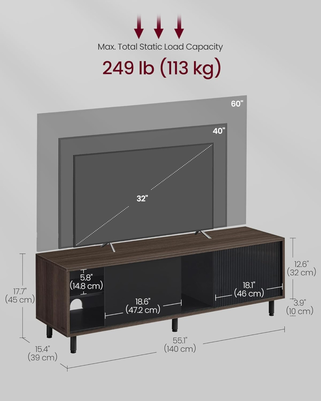 VASAGLE Modern TV Szekrény 60 colos TV-hez Bordázott Üveggel Kőrisfa-Fekete