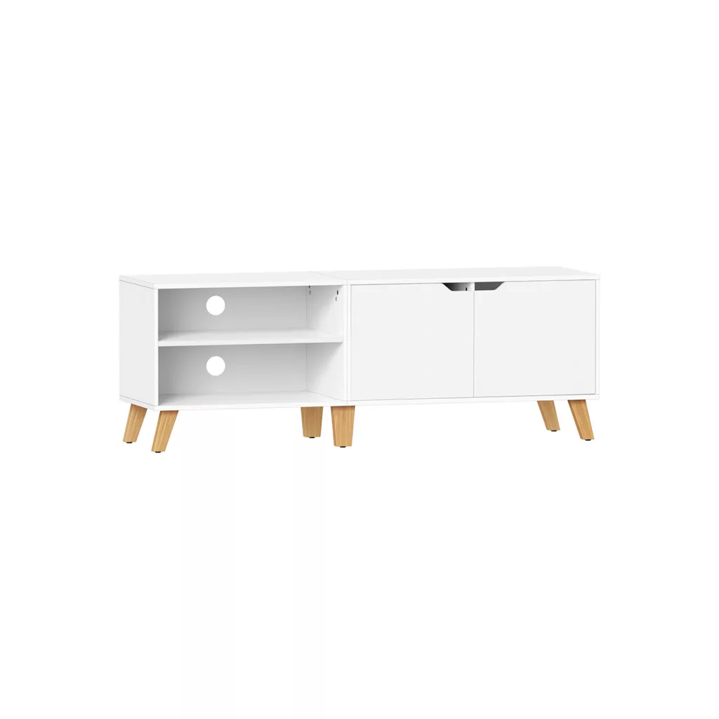 Ez a skandináv stílusú TV szekrény tökéletes egyensúlyt teremt az esztétika és funkcionalitás között. A fehér színű, fából készült lábakkal ellátott bútor két nyitott polccal és két zárt tárolórésszel rendelkezik, amelyek ideálisak a médiaeszközök és kiegészítők rendezett tárolására.