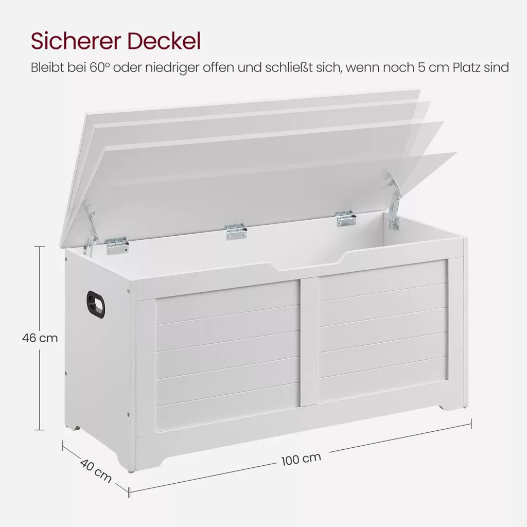 Ez a matt fehér tárolópad egyesíti a praktikumot az eleganciával. A beépített biztonsági zsanérok gondoskodnak a biztonságos használatról, míg a tágas belső tér bőséges helyet biztosít takarók, párnák és egyéb tárgyak tárolására.