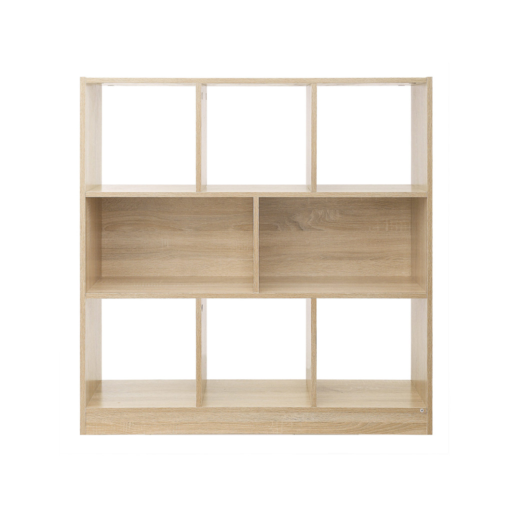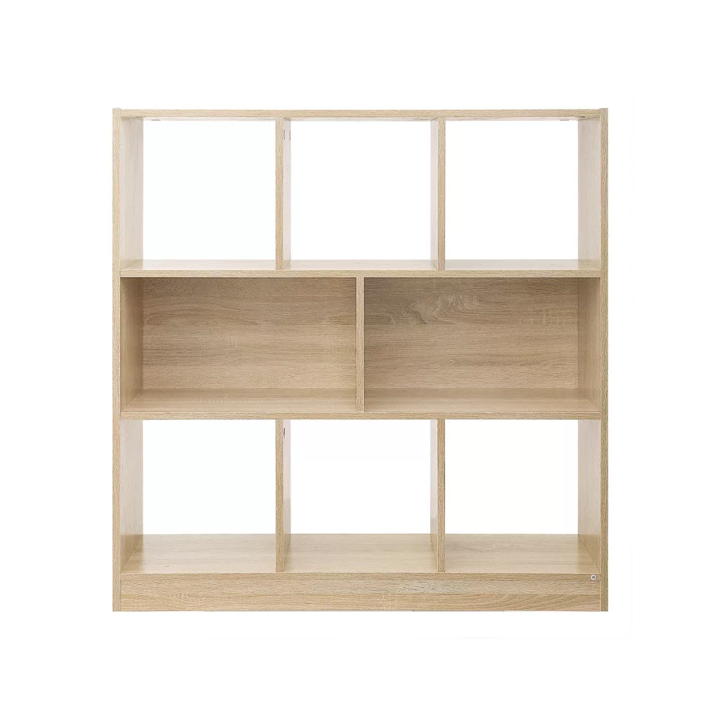 Modern kialakítású, tölgy színű könyvespolc 8 praktikus tárolórekesszel, amely tökéletes megoldást nyújt könyvek és dekorációs tárgyak tárolására.