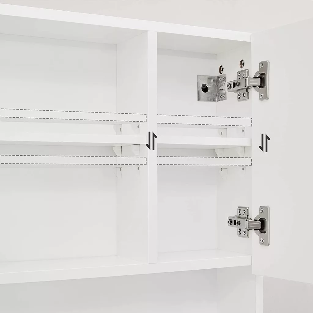Ez a modern fürdőszobai szekrény ötvözi a praktikus tárolást az elegáns megjelenéssel. A magasfényű fehér ajtó és a minőségi tükör felület tökéletesen illeszkedik bármilyen fürdőszobai környezetbe. A két állítható polc és az alsó nyitott tároló maximális rugalmasságot biztosít a mindennapi használati tárgyak elrendezésében.