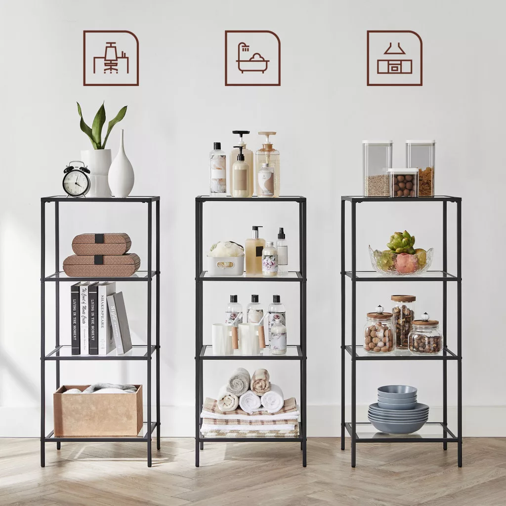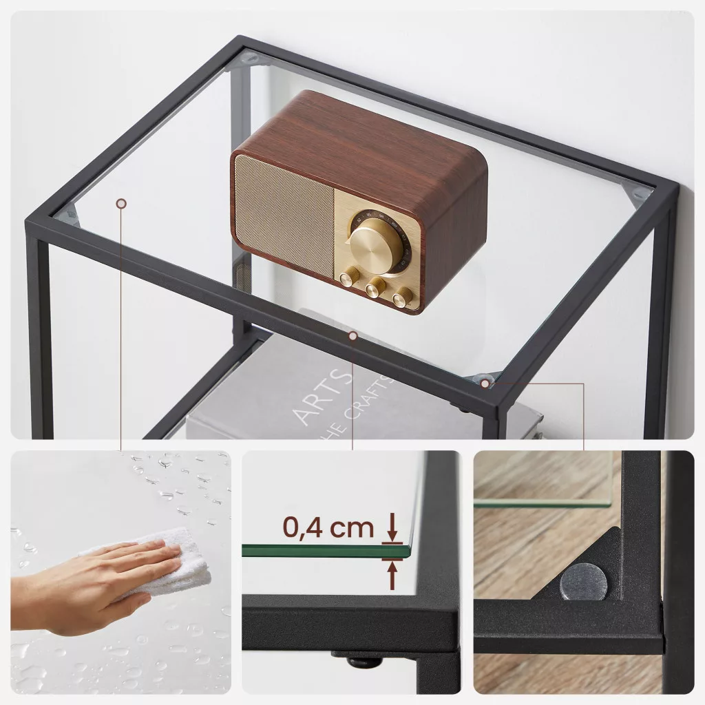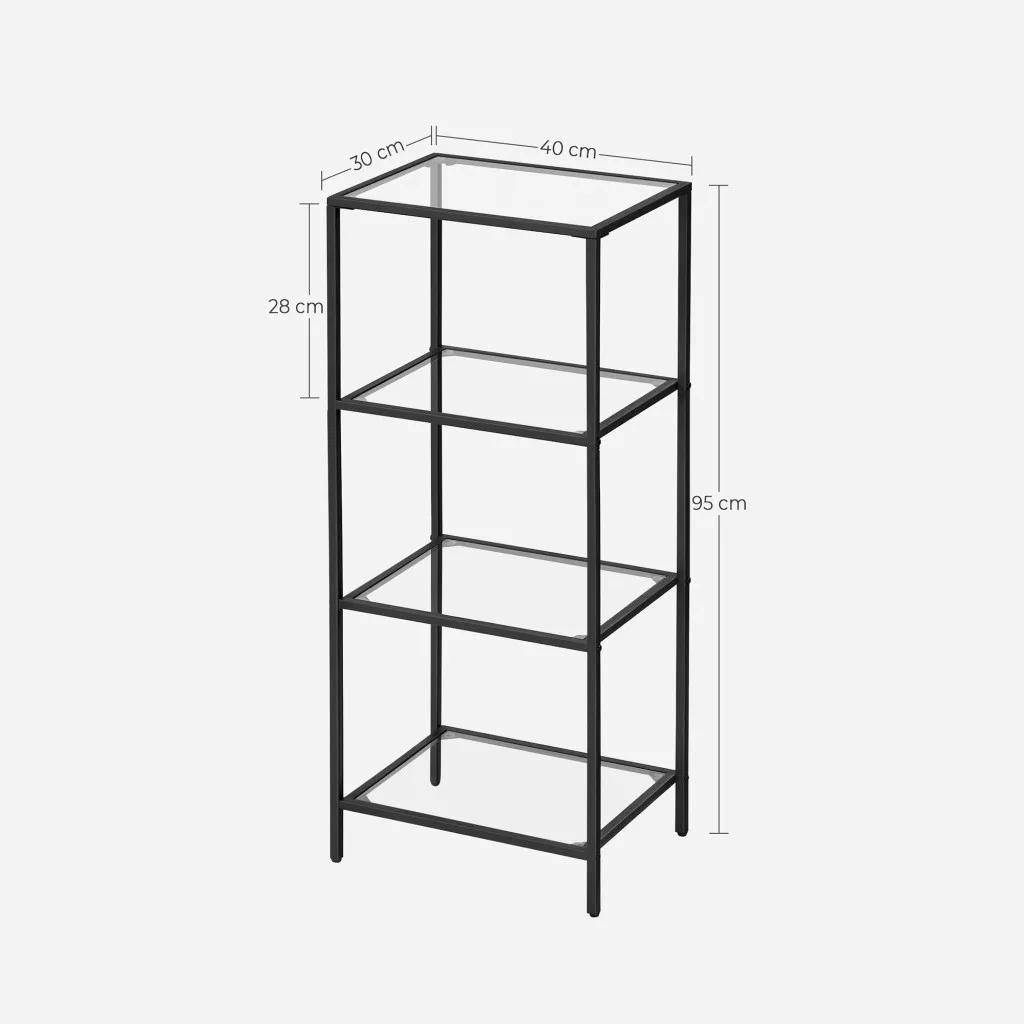 Ez a modern vonalvezetésű, 4 szintes állvány ötvözi az elegáns megjelenést a praktikus tárolással. A 4 mm vastag edzett üvegpolcok és a robusztus fekete fémváz együttesen biztosítják a tartósságot és a stílusos megjelenést. A polcok egyenként 10 kg teherbírással rendelkeznek, így ideális megoldást nyújtanak könyvek, dekorációs tárgyak és személyes holmik tárolására.