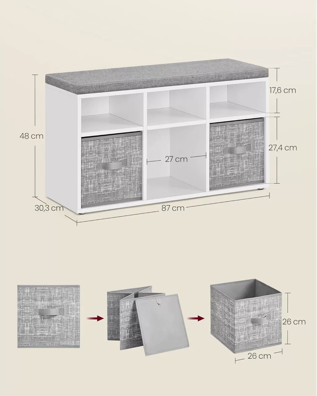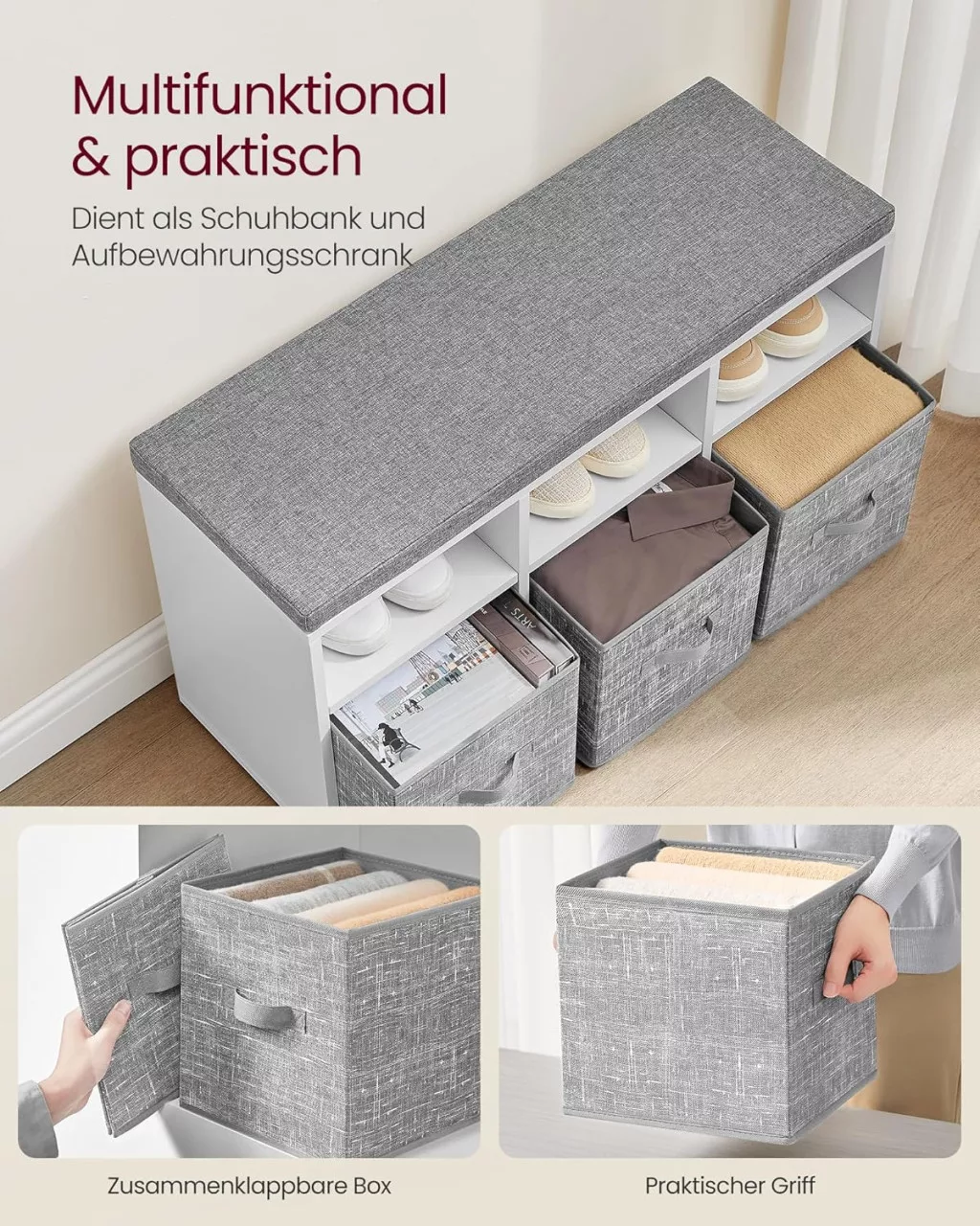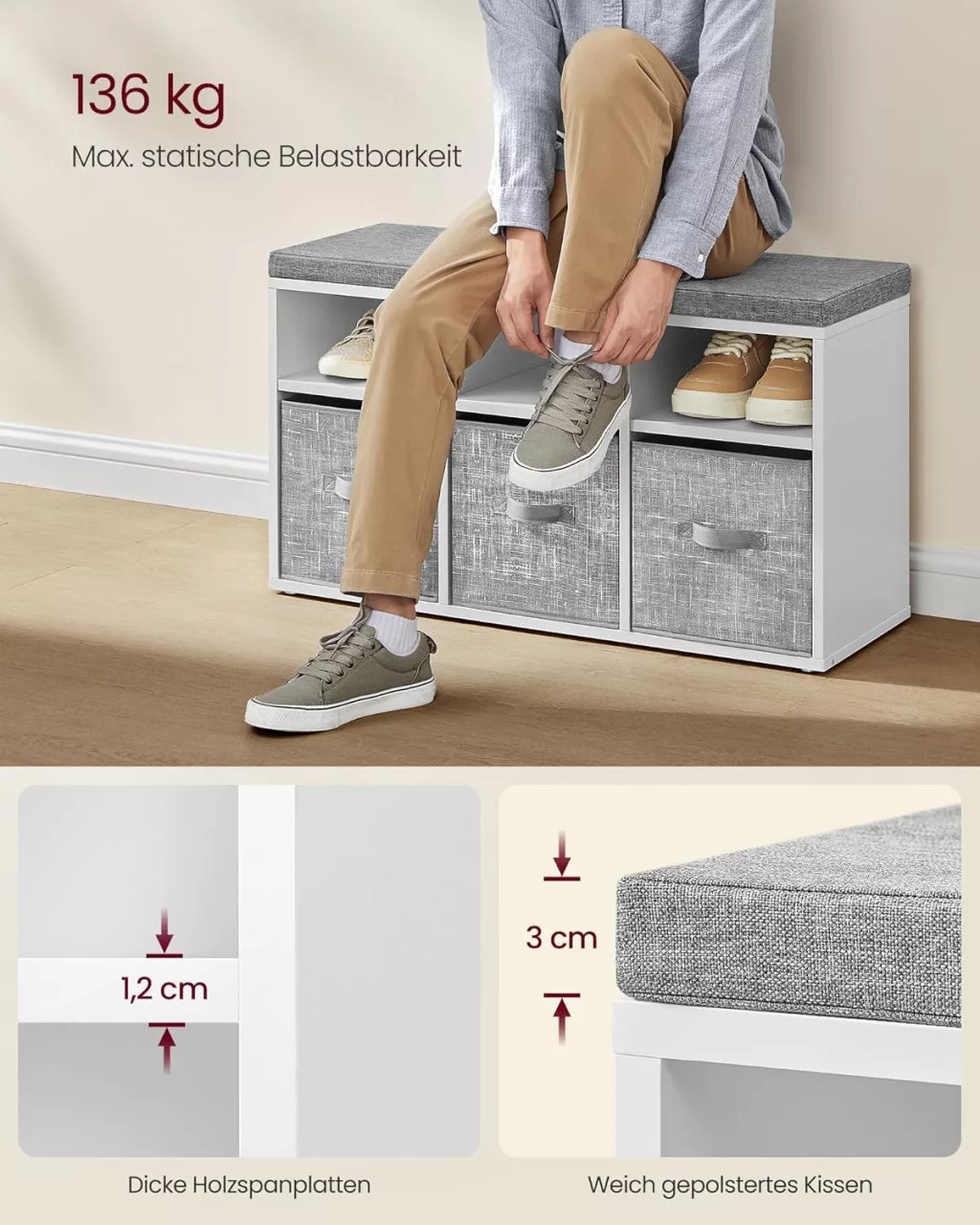Elegáns és praktikus cipőspad párnázott ülőfelülettel, 6 rekesszel és 3 tárolódobozzal az előszoba rendezettségéért.
