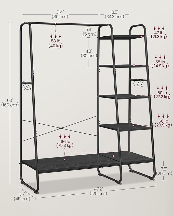 A matt fekete kivitel és az ipari dizájn tökéletesen illeszkedik bármilyen lakberendezési stílushoz. A 160 cm magas állvány bőséges helyet biztosít hosszú kabátoknak, míg az oldalsó akasztók és polcok ideálisak táskák, kiegészítők tárolására.
