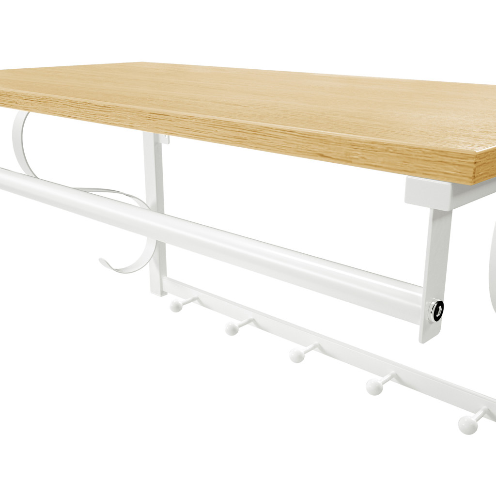 Elegáns, háromfunkciós fali fogas polccal, akasztórúddal és 5 kampóval, amely tökéletes megoldást nyújt a rendezett tároláshoz az előszobában, fürdőszobában vagy hálószobában.