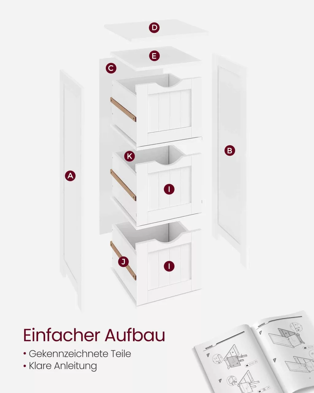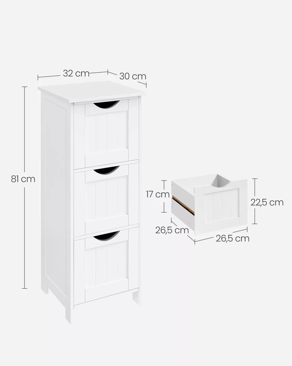 Ez a karcsú, matt fehér tárolószekrény tökéletesen ötvözi a funkcionalitást és a skandináv design elemeit. A három tágas fiók bőséges helyet biztosít fürdőszobai kellékek, kozmetikumok és egyéb használati tárgyak rendszerezett tárolásához.