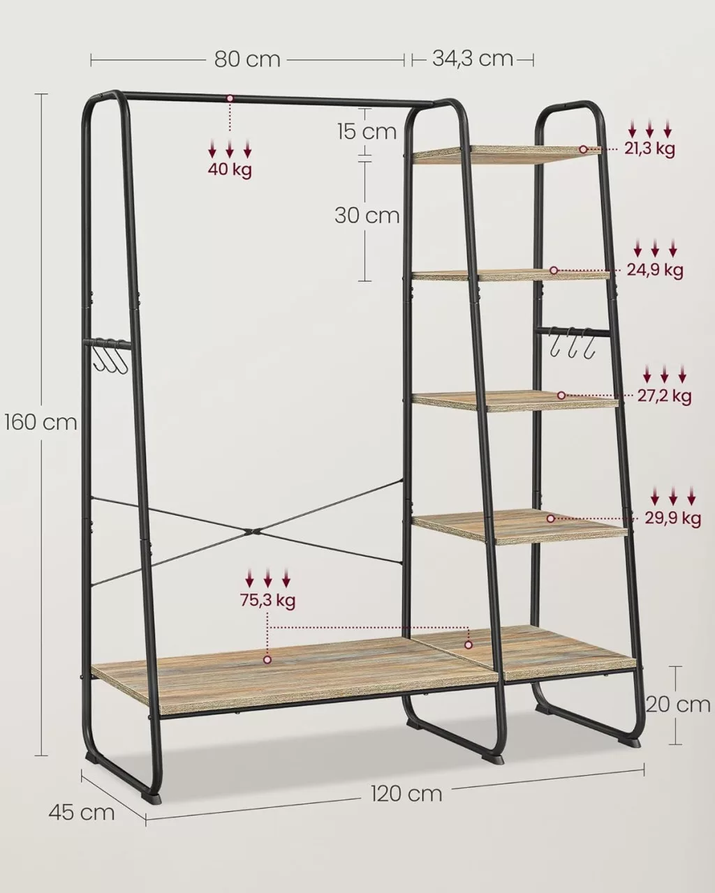 Ez a modern kialakítású ruhaállvány egyesíti a praktikumot az esztétikummal. A 160 cm magas állvány ruhaakasztó rúdja bőséges helyet biztosít kabátoknak és ingeknek, míg az 5 polcos rendszer ideális táskák, dobozok és egyéb kiegészítők tárolására.