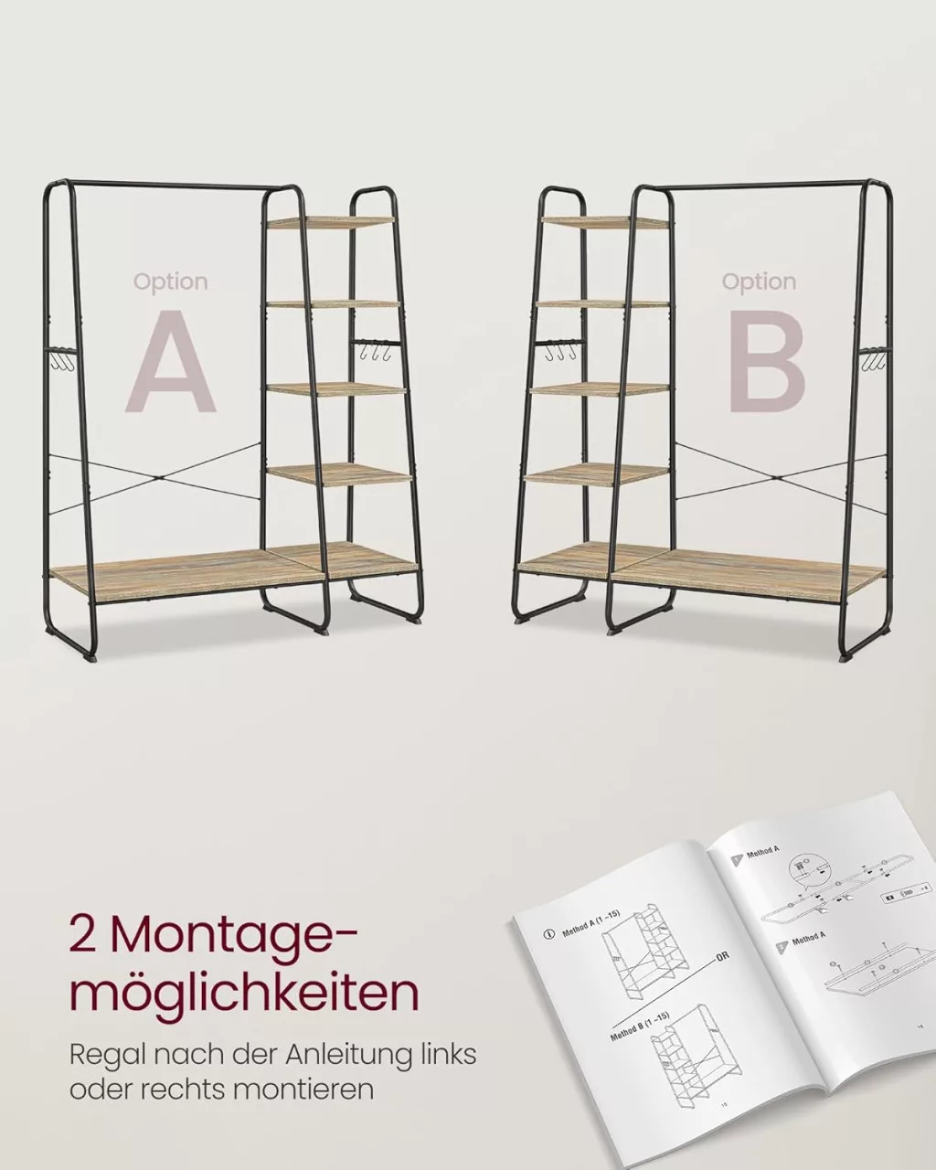 Az A-alakú váz és az X-merevítés kivételes stabilitást biztosít, a minőségi forgácslapból és acélcsövekből készült szerkezet pedig akár 220 kg összsúlyt is elbír. A 6 levehető kampó további tárolási lehetőséget kínál, az alsó polc pedig kifejezetten cipők számára lett kialakítva.