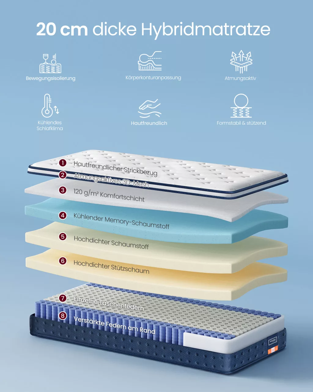 A VASAGLE hibrid matrac forradalmi megoldást kínál azok számára, akik a legmagasabb minőségű alvási élményre vágynak. A matrac egyedi szerkezete ötvözi a független zsebrugók stabil támasztását a gél memóriahab puha, testhez simuló kényelmével. Az egymástól függetlenül működő zsebrugók minimálisra csökkentik a mozgás átadódását, így partnere forgolódása nem zavarja meg az Ön nyugalmát. A 7 zónás felépítés pontosan ott nyújt támogatást, ahol a testének szüksége van rá, míg a vállakat és csípőt enyhíti, megelőzve a hátfájást.
