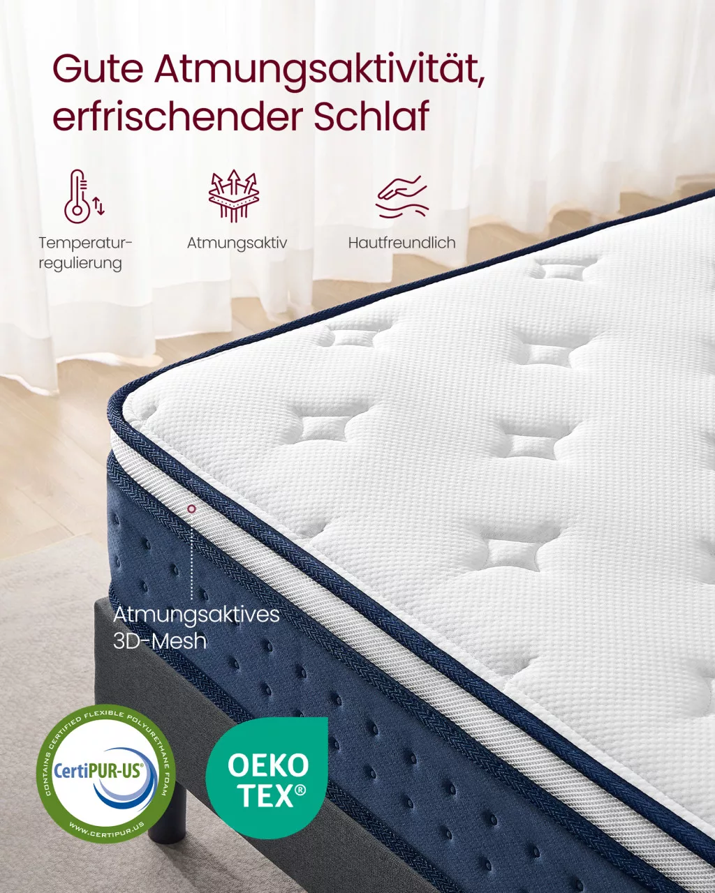 • Hűvös alvási környezet: A gél memóriahab és a légáteresztő huzat optimális hőszabályozást biztosít az egész éjszaka folyamán