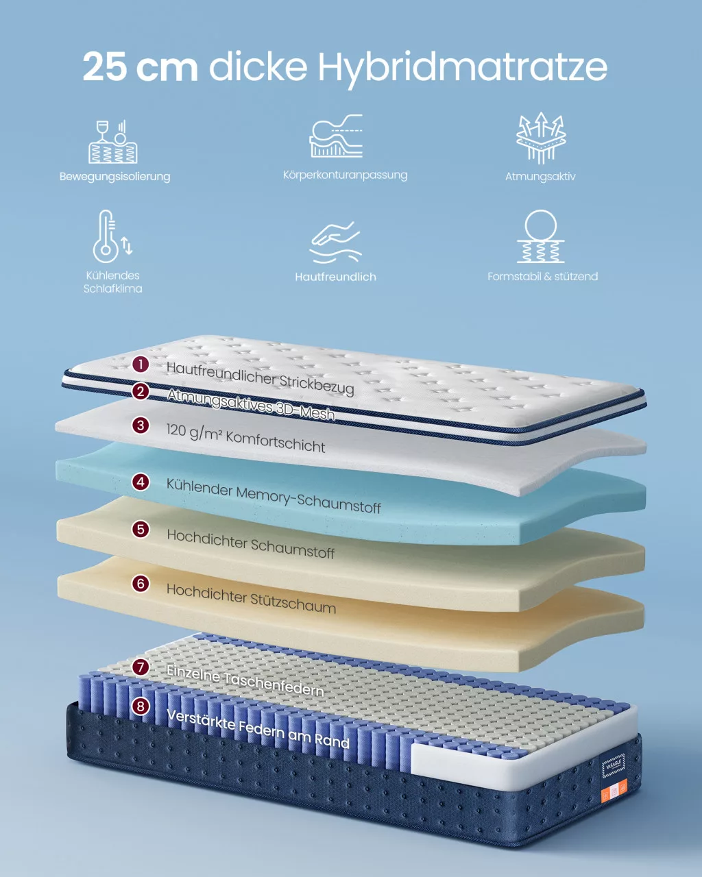 A VASAGLE hibrid matrac tökéletes alvást biztosít a zsákrugós rendszer és a gél memory foam kombinációjával. A 7 zónás támasztás és a légáteresztő huzat garantálja a pihentető éjszakákat, miközben a mozgásszigetelés megakadályozza a partner mozgásának átadódását.
