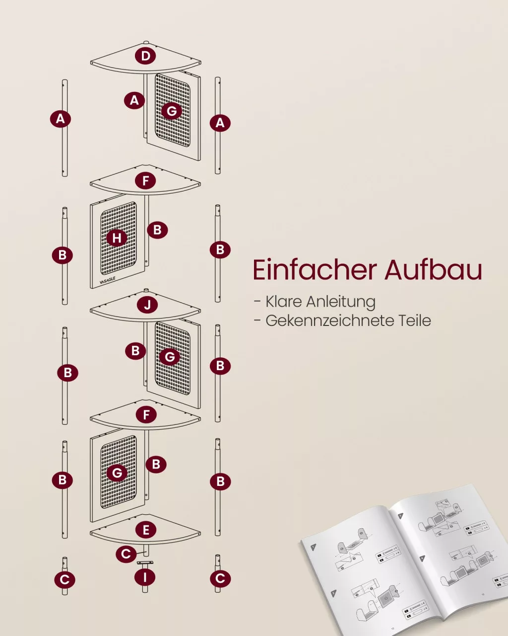 Ez a modern sarokpolc tökéletesen ötvözi a funkcionalitást és az esztétikumot. A rattan hatású oldalpanelek természetes melegséget kölcsönöznek, míg a stabil fém váz és MDF polcok tartósságot biztosítanak. Az öt polcszint bőséges helyet kínál könyvek, dekorációs tárgyak és személyes holmik tárolására.