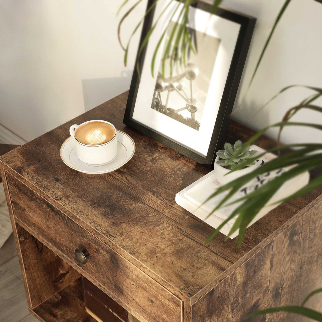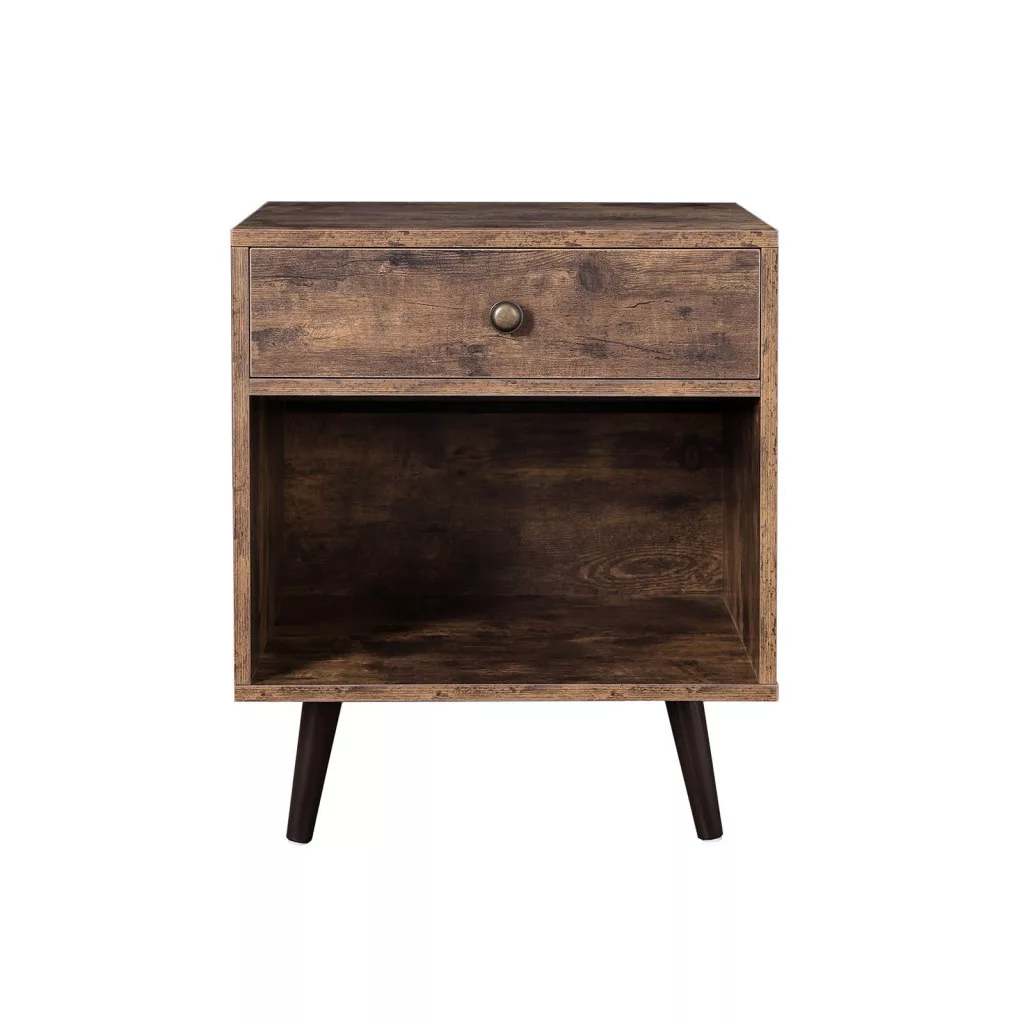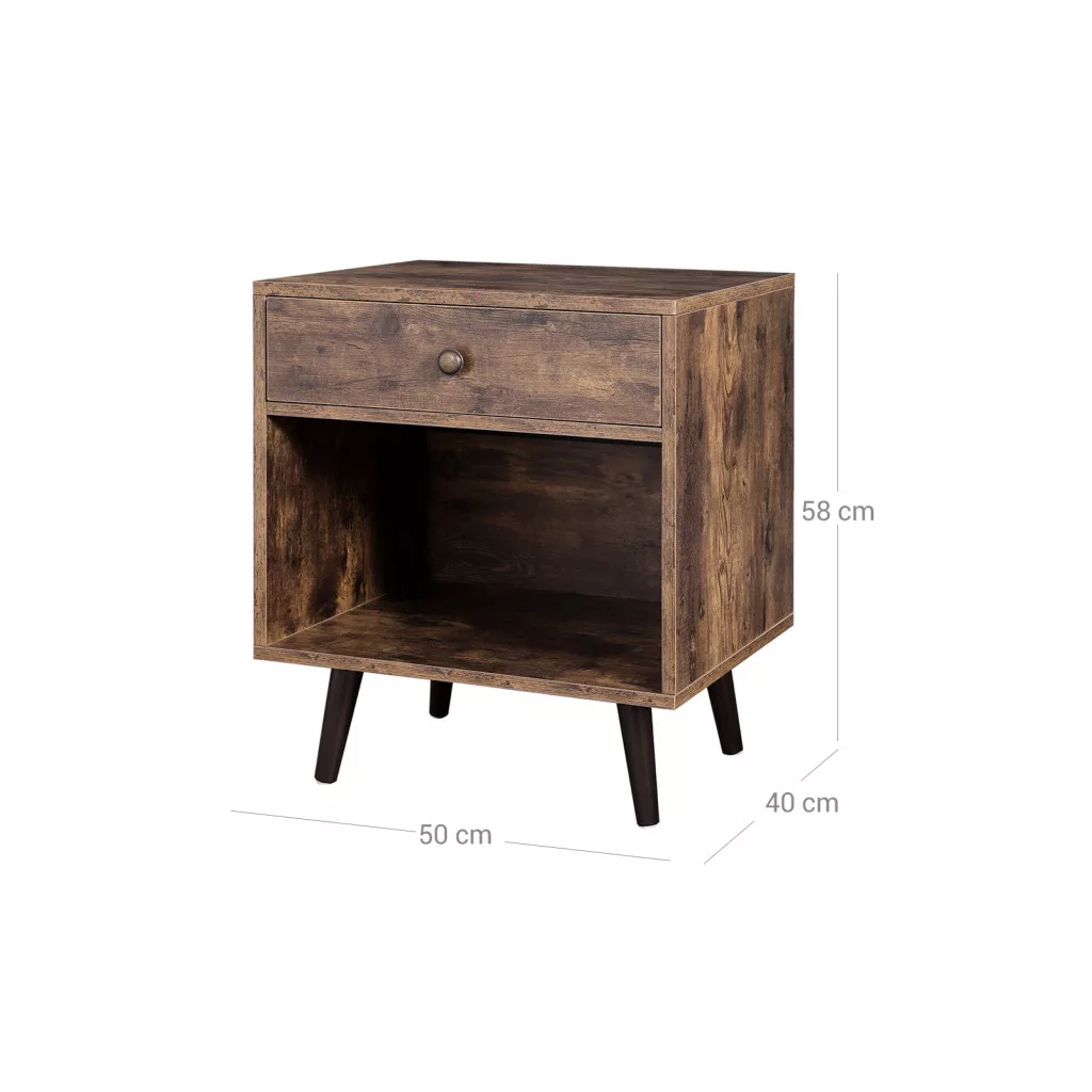 Ez a rusztikus barna éjjeliszekrény a retro design és a praktikus tárolás tökéletes kombinációja. A fiókok és a nyitott polc ideális helyet biztosítanak az éjszakai kellékek tárolására, míg a fenyőfa lábak és az antik hatású fogantyú vintage hangulatot teremtenek.