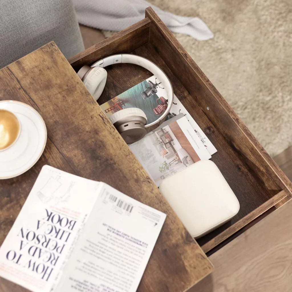 • Kétszintes tárolás: Fiók a személyes tárgyaknak és nyitott polc a dekorációnak