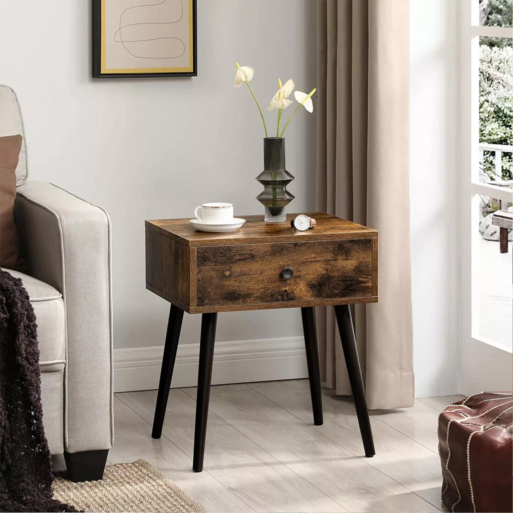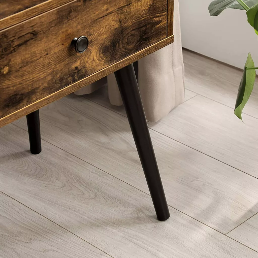 Ez a VASAGLE éjjeliszekrény tökéletesen ötvözi a vintage bájt a praktikus funkcionalitással. A rusztikus barna színű bútor kiemelkedő minőségű faforgácslapból készült, stabil fenyőfa lábakkal és elegáns fém fogantyúval. A karcsú, kúpos lábak és a letisztult vonalak a mid-century modern stílust idézik.