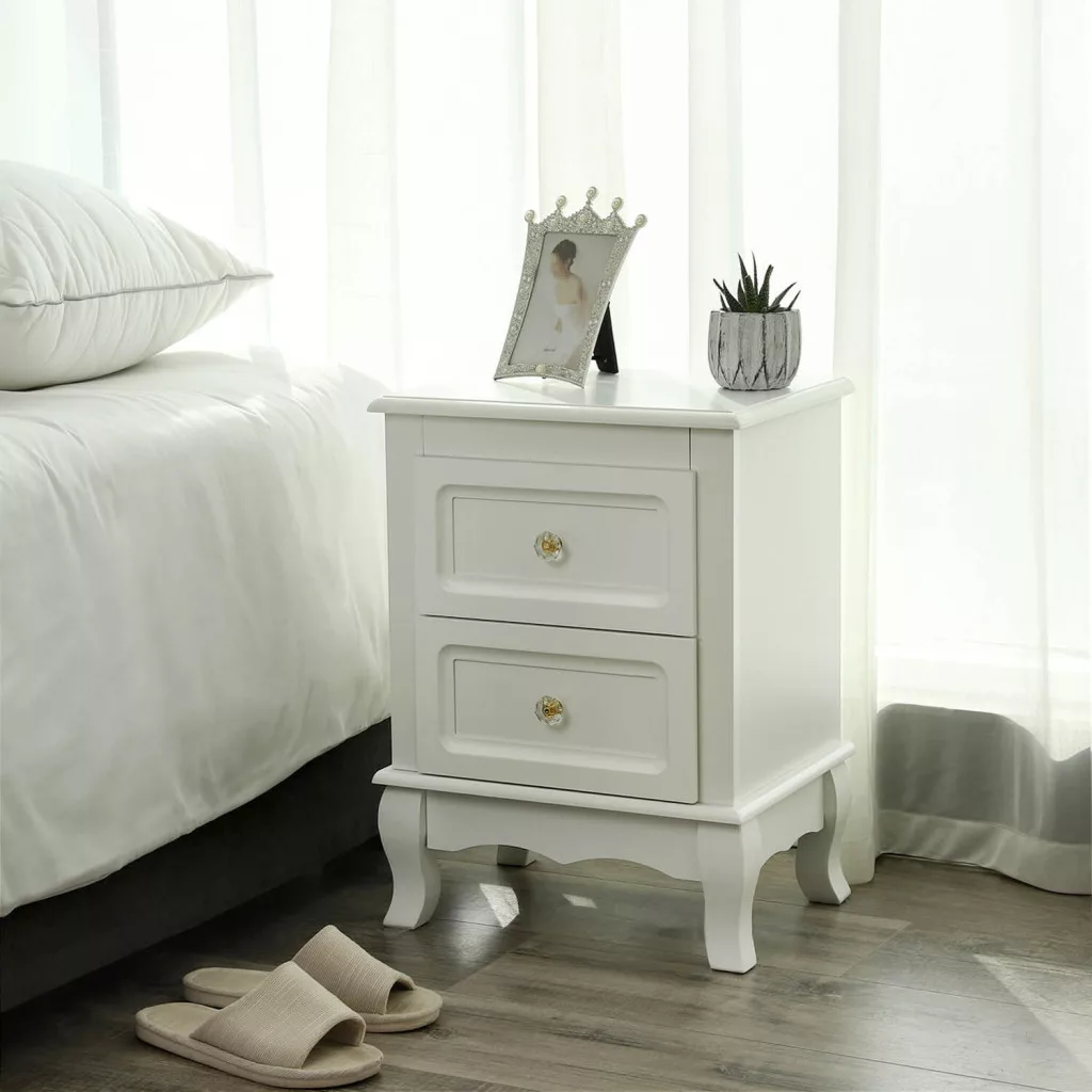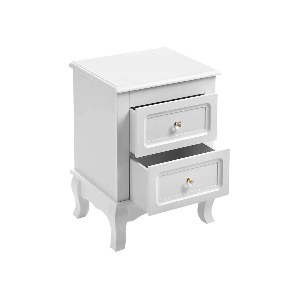 Ez a két darabos fehér éjjeliszekrény szett tökéletesen ötvözi a klasszikus romantikus stílust a modern funkcionalitással. Az ívelt lábak és a részletgazdag fiókfrontok elegáns megjelenést kölcsönöznek, míg a UV-kezelt fehér festés időtálló szépséget biztosít.