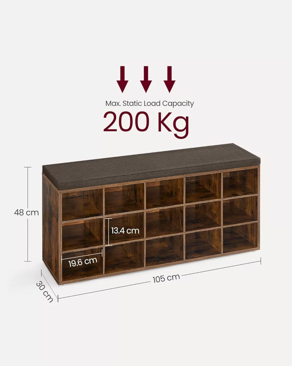Ez a rusztikus barna cipőtároló pad egyesíti a praktikumot az eleganciával. A 15 nyitott rekesz bőséges helyet biztosít akár férfi cipők számára is, míg a puha párnázott ülőfelület kényelmes helyet kínál a cipők fel- és levételéhez.