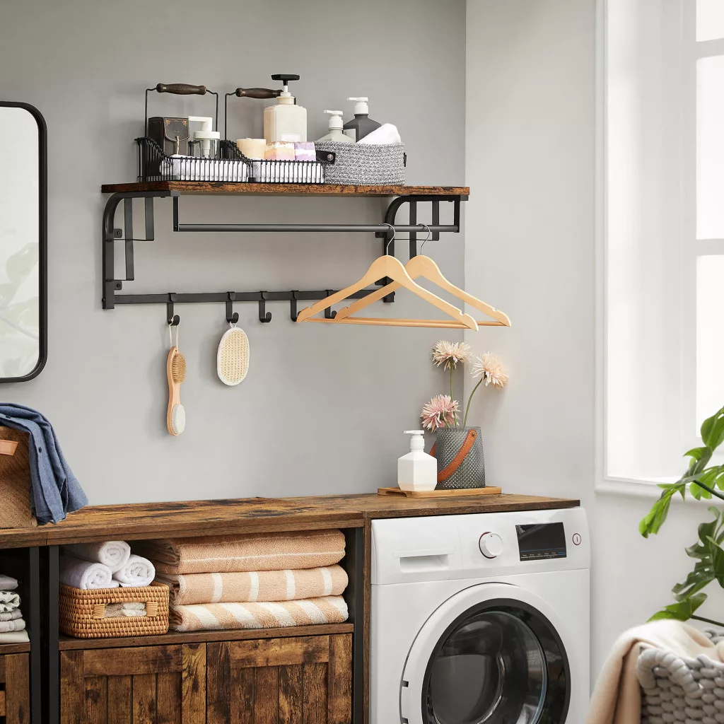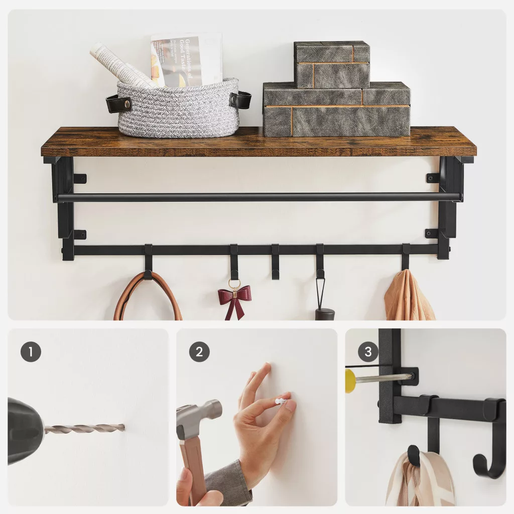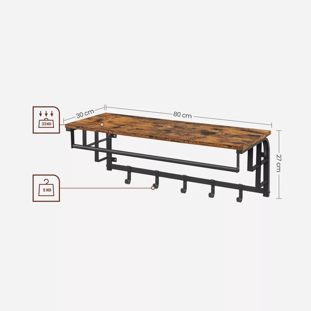 Ez a praktikus fali fogas egyesíti a stílusos megjelenést a funkcionalitással. A rusztikus barna polclap és a fekete fém váz tökéletes összhangot alkot, míg a beépített ruhaakasztó rúd és az 5 levehető kampó maximális tárolási rugalmasságot biztosít.