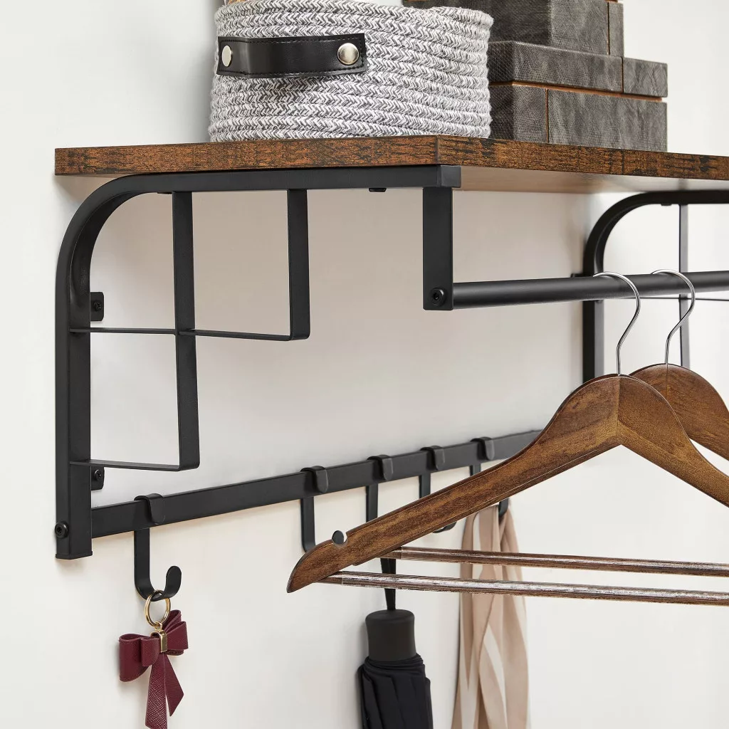 VASAGLE Rusztikus Fali Fogas Polccal és 5 Akasztóval Ipari Stílusú Barna-Fekete