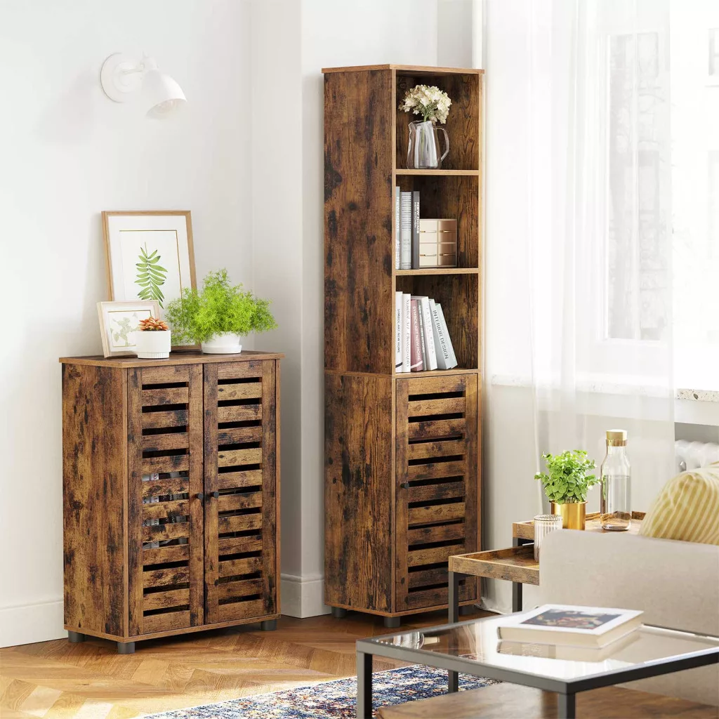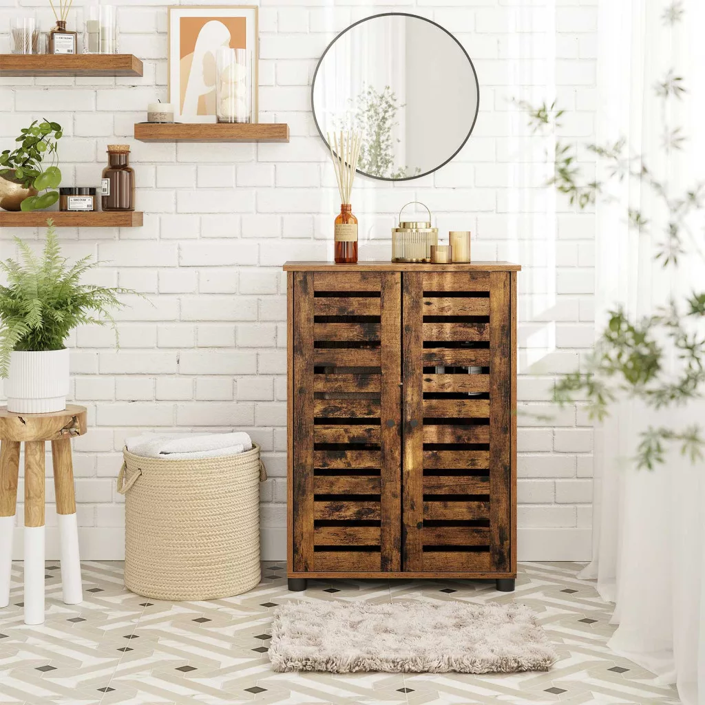 VASAGLE Rusztikus Fürdőszobai Tárolószekrény Zsalus Ajtókkal