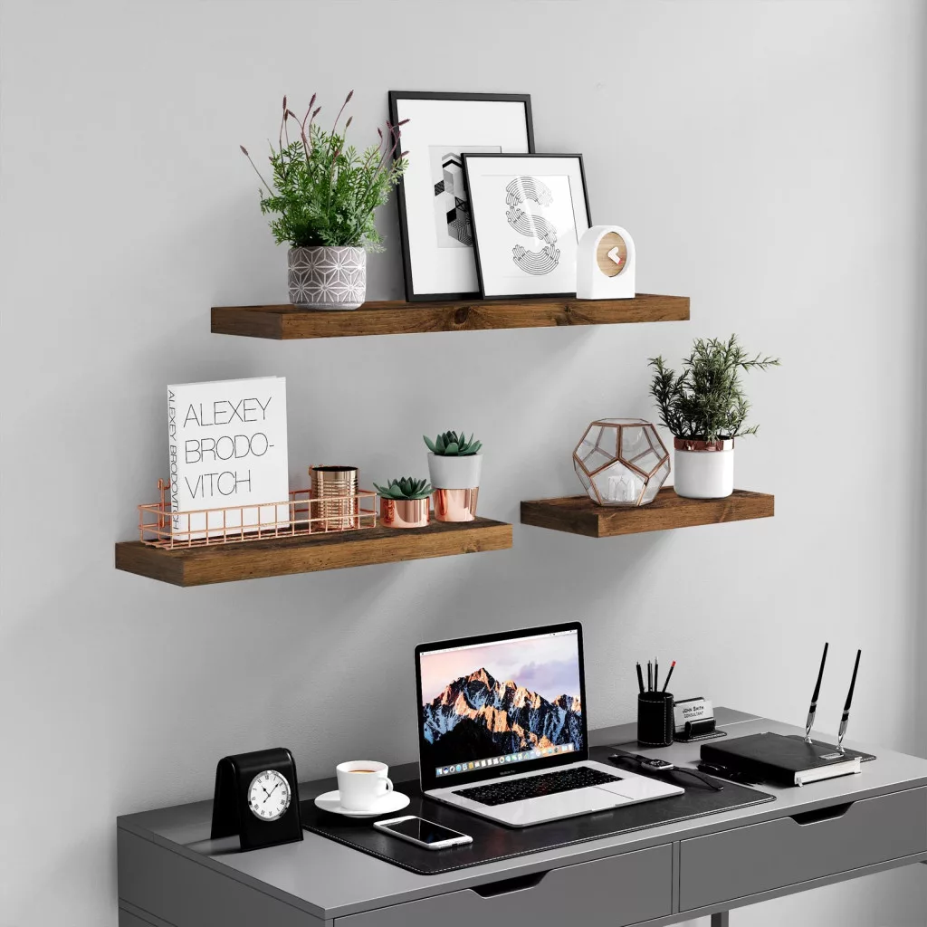 Stílusos, rusztikus barna lebegő fali polc, amely tökéletes megoldás fotók, dekorációk és könyvek tárolására akár 15 kg teherbírással.