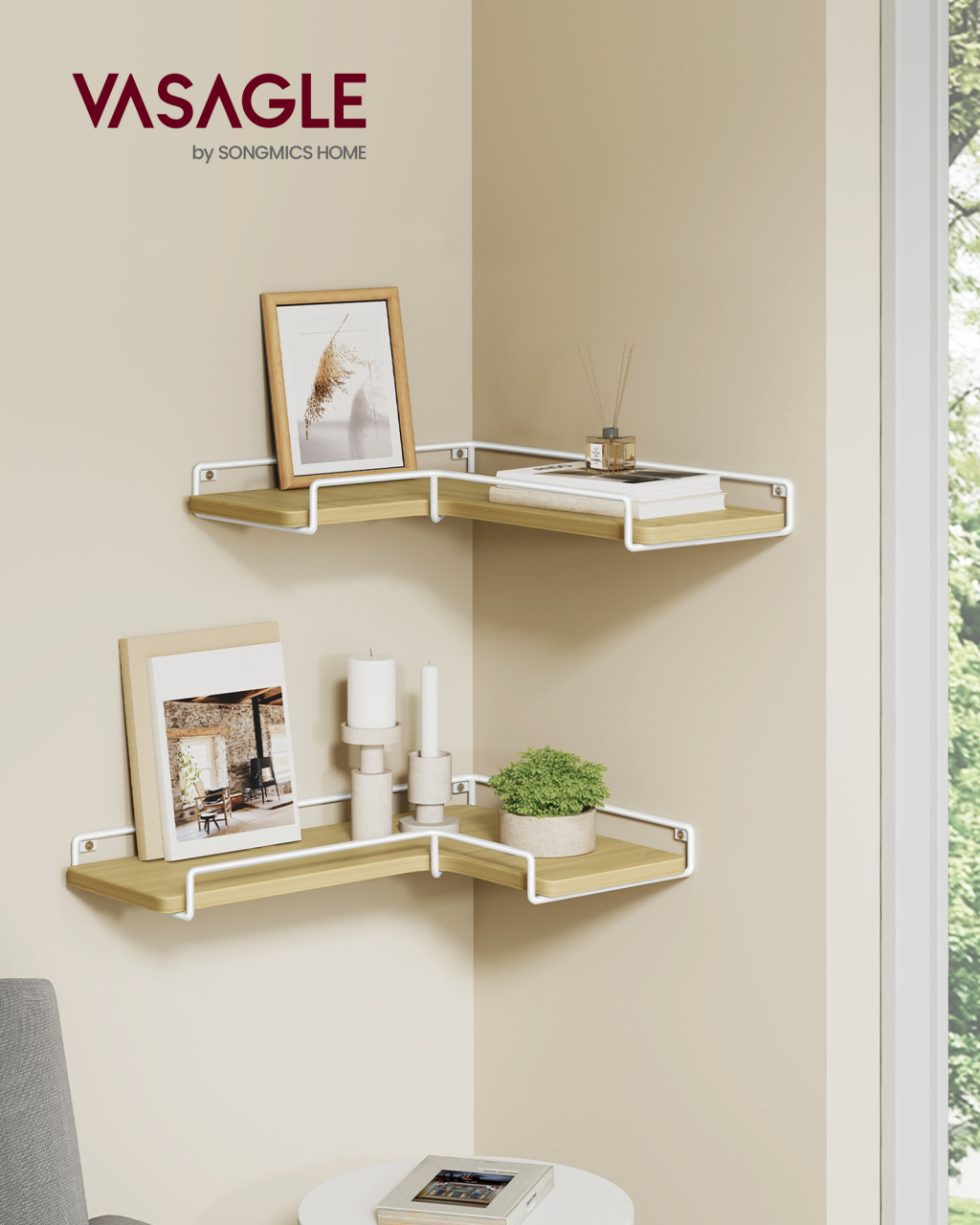 A VASAGLE sarokpolc szett innovatív megoldást kínál az üres sarkok hasznosítására. A természetes tölgy mintázatú polcok és a fehér védőkeret harmonikus kombinációja nem csak praktikus tárolóhelyet biztosít, de dekoratív elemként is szolgál otthonában.