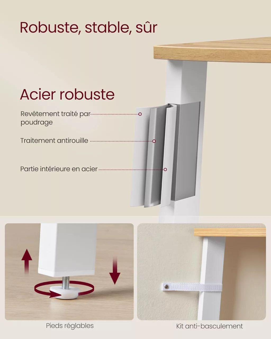 Ez az elegáns sarokpolc rendszer tökéletes megoldást kínál a kihasználatlan sarkok hasznosítására. A természetes tölgy polclapok és a matt fehér acélváz harmonikus kombinációja modern ipari stílust kölcsönöz otthonának. A stabil, háromlábú konstrukció és az állítható láb garantálja a biztonságos használatot.