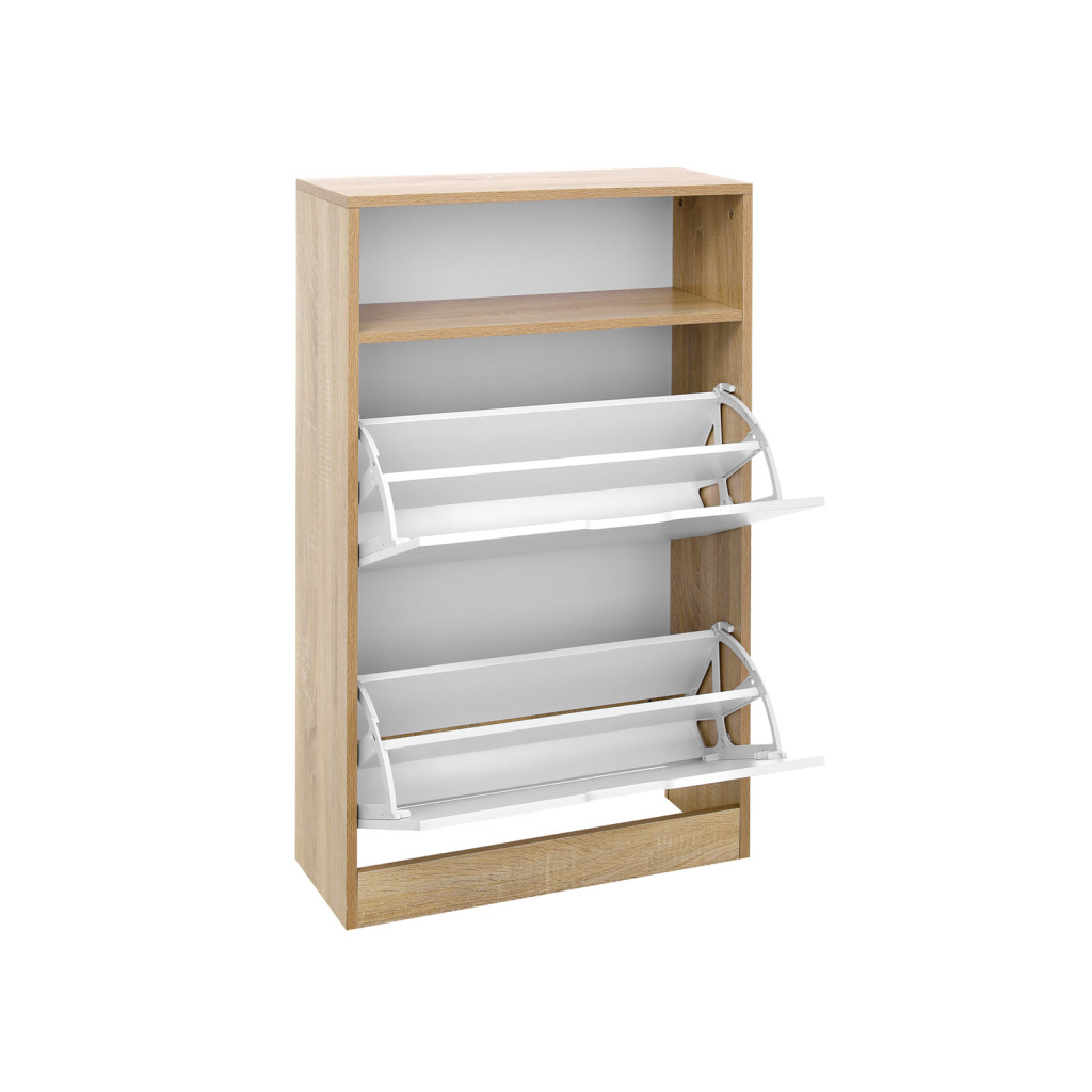 Elegáns, skandináv stílusú cipősszekrény két lehajtható ajtóval és praktikus nyitott polccal, amely tökéletes megoldást nyújt a cipők rendezett tárolására és az előszoba rendezettségének megőrzésére.