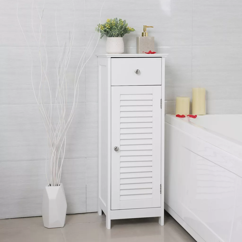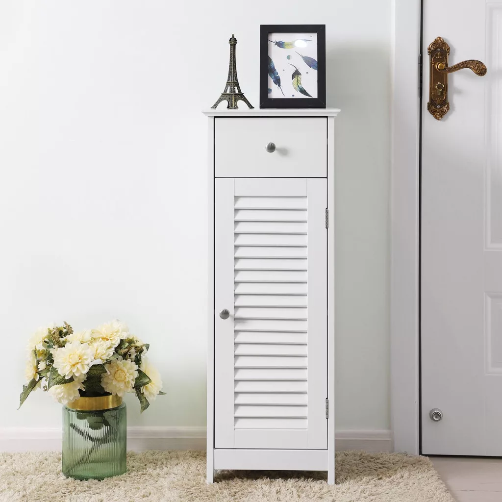 Elegáns, keskeny tárolószekrény zsalus ajtóval és fiókkal, amely tökéletes megoldást nyújt a fürdőszoba vagy más helyiségek rendszerezéséhez.