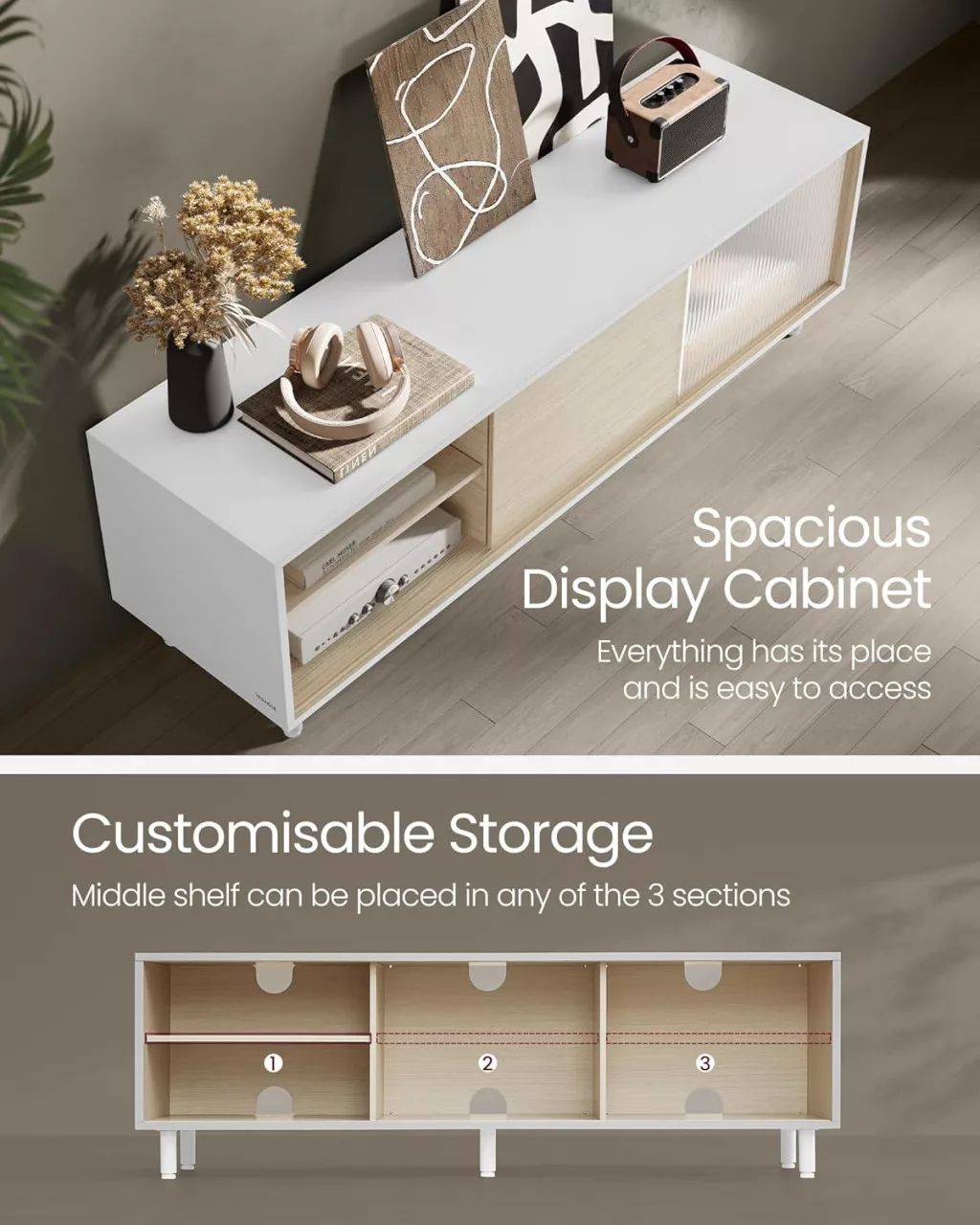 • Sokoldalú tárolási lehetőségek: A csúsztatható ajtók és állítható polcok lehetővé teszik, hogy igényei szerint mutassa meg vagy rejtse el médiaeszközeit, miközben a bordázott üveg diszkrét tárolást biztosít