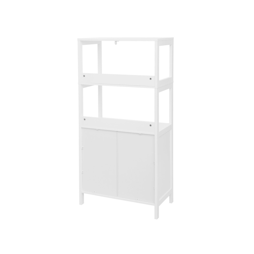 Ez az elegáns fehér szekrény praktikus megoldást kínál a rendszerezett tároláshoz. A két nyitott polc ideális a gyakran használt tárgyak könnyen elérhető elhelyezésére, míg a fiók és a kétajtós szekrényrész a kevésbé használt vagy elrejtendő holmik tárolására szolgál.