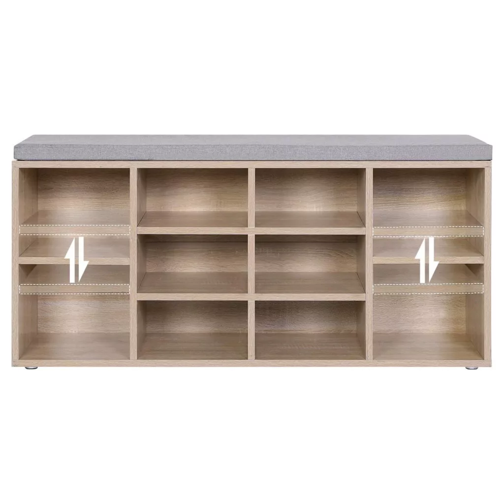 Ez az elegáns tölgy színű cipősszekrény-pad kombináció tökéletesen ötvözi a funkcionalitást és a stílust. A 10 tágas rekesz lehetővé teszi akár 44-es méretű cipők és csizmák rendezett tárolását, míg a szürke párnázott ülőfelület kényelmes helyet biztosít a cipők fel- és levételéhez.