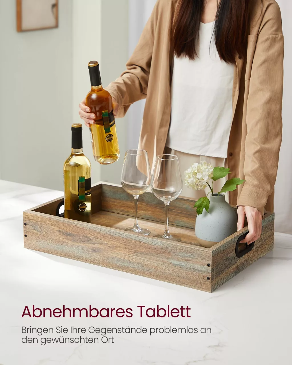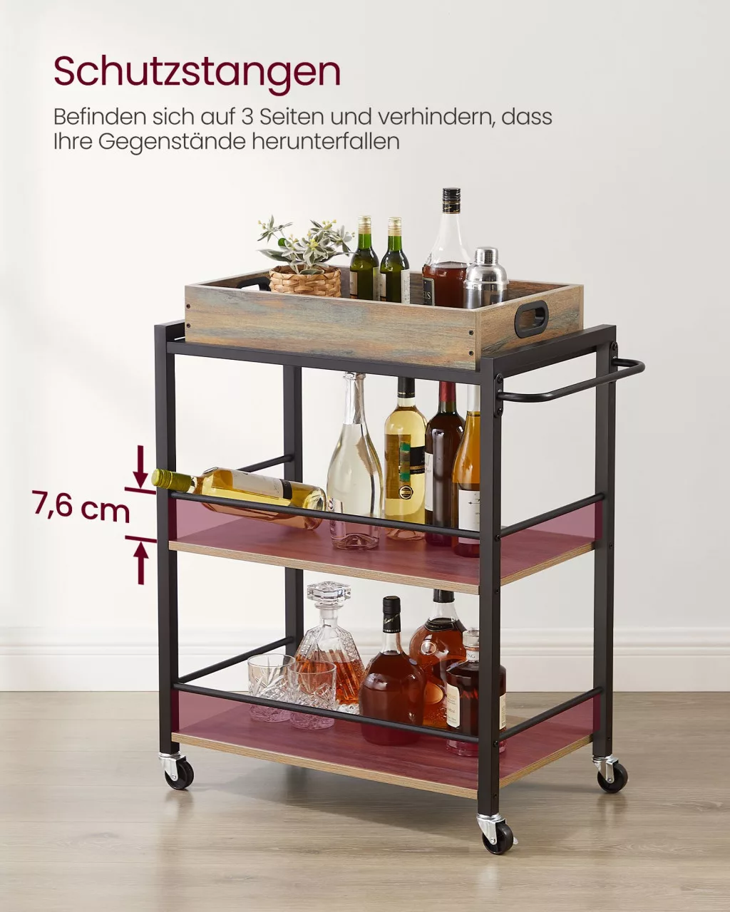 A négy kerék, melyből kettő fékezhető, valamint az állítható lábak lehetővé teszik, hogy a kocsi mobil vagy fix tárolóként is használható legyen. A felső levehető tálca praktikus megoldást nyújt az italok és ételek biztonságos szervírozásához.