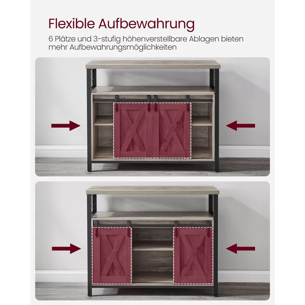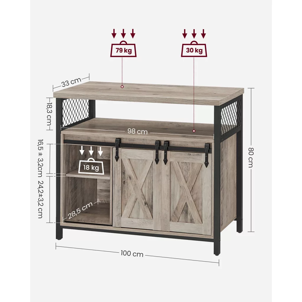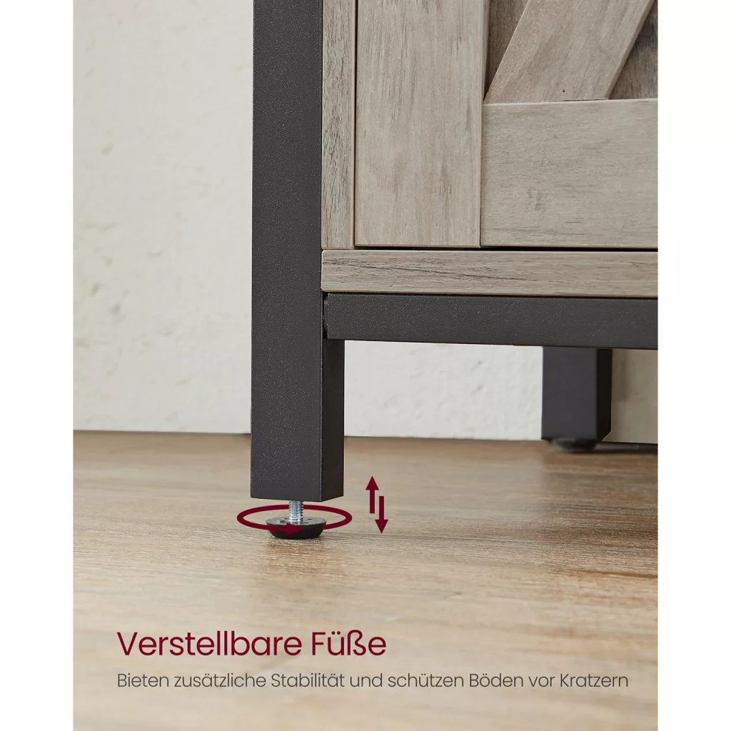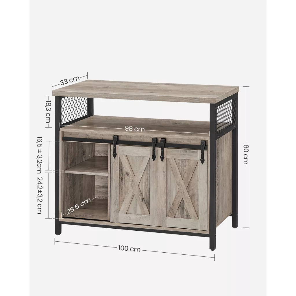 Ez a VASAGLE tárolószekrény egyedi X-mintás tolóajtóival és ipari stílusú fém kereteivel azonnal magára vonzza a tekintetet. A szürke-fekete színkombináció és a rusztikus dizájn tökéletesen illeszkedik mind modern, mind klasszikus enteriőrökbe.