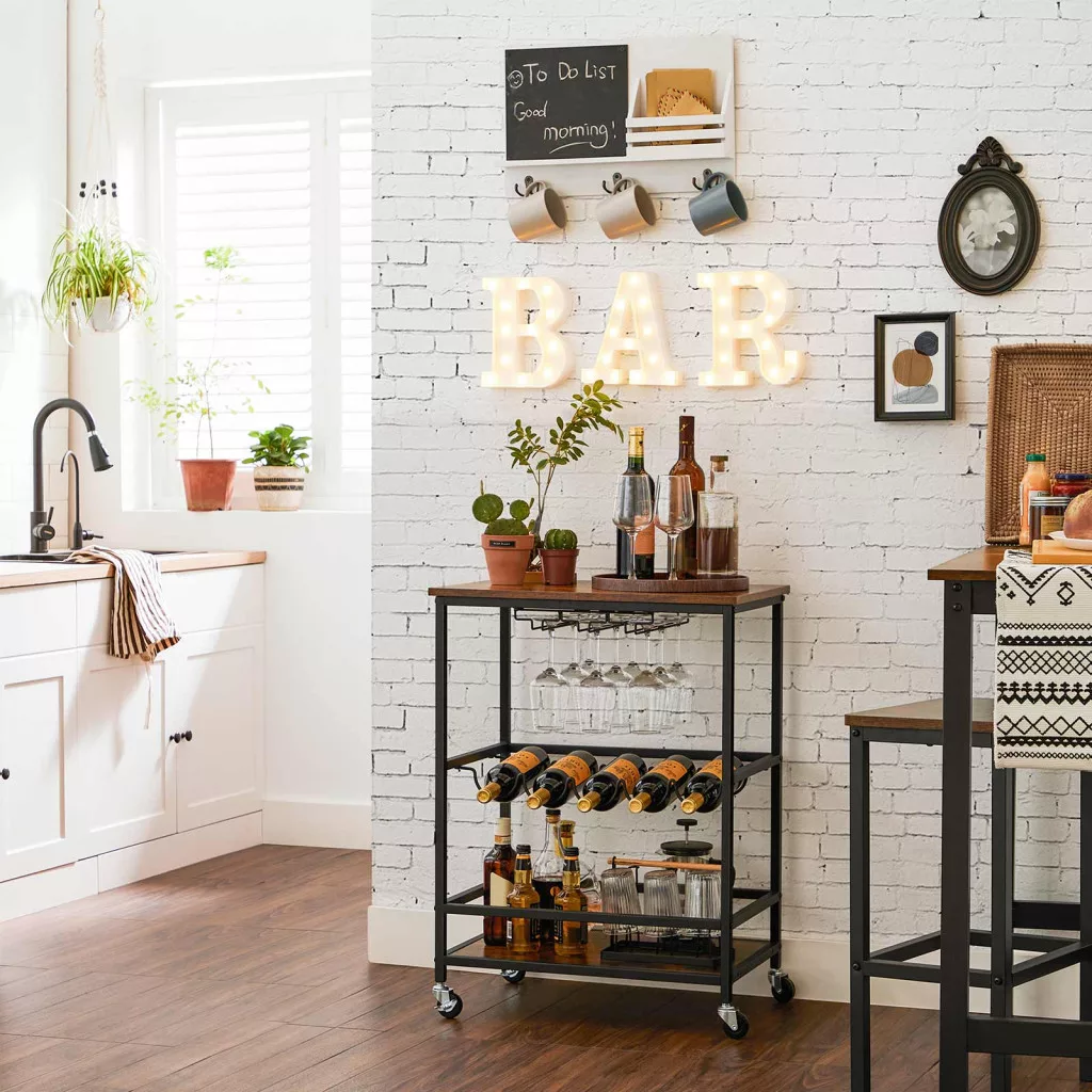Ez a VASAGLE bárszekrény ötvözi a vintage barna fa és fekete fém elemeket egy időtlen ipari stílusban. A praktikus kialakítás 3 pohártartót és 5 palacktartót kínál, valamint tágas polcfelületeket az italok és kiegészítők tárolására.