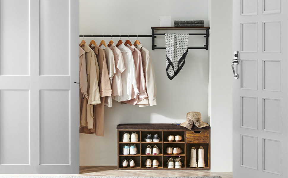 Ez a vintage stílusú cipőspad egyesíti a praktikus tárolást és a kényelmes ülőhelyet. A 10 nyitott rekesz és egy fiók segítségével rendszerezetten tárolhatja cipőit és egyéb előszobai kellékeket. A barna színű, fából készült bútor tökéletesen illeszkedik bármilyen enteriőrbe.