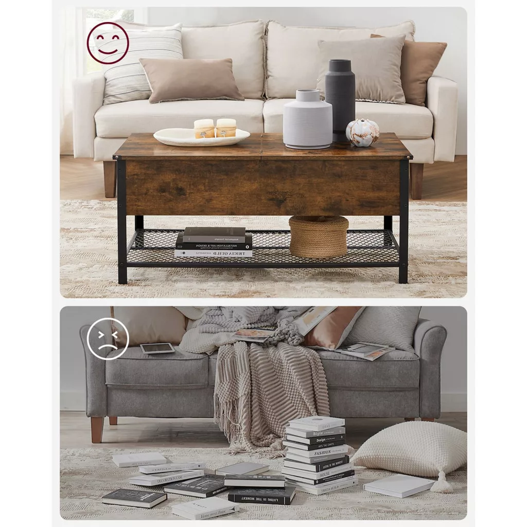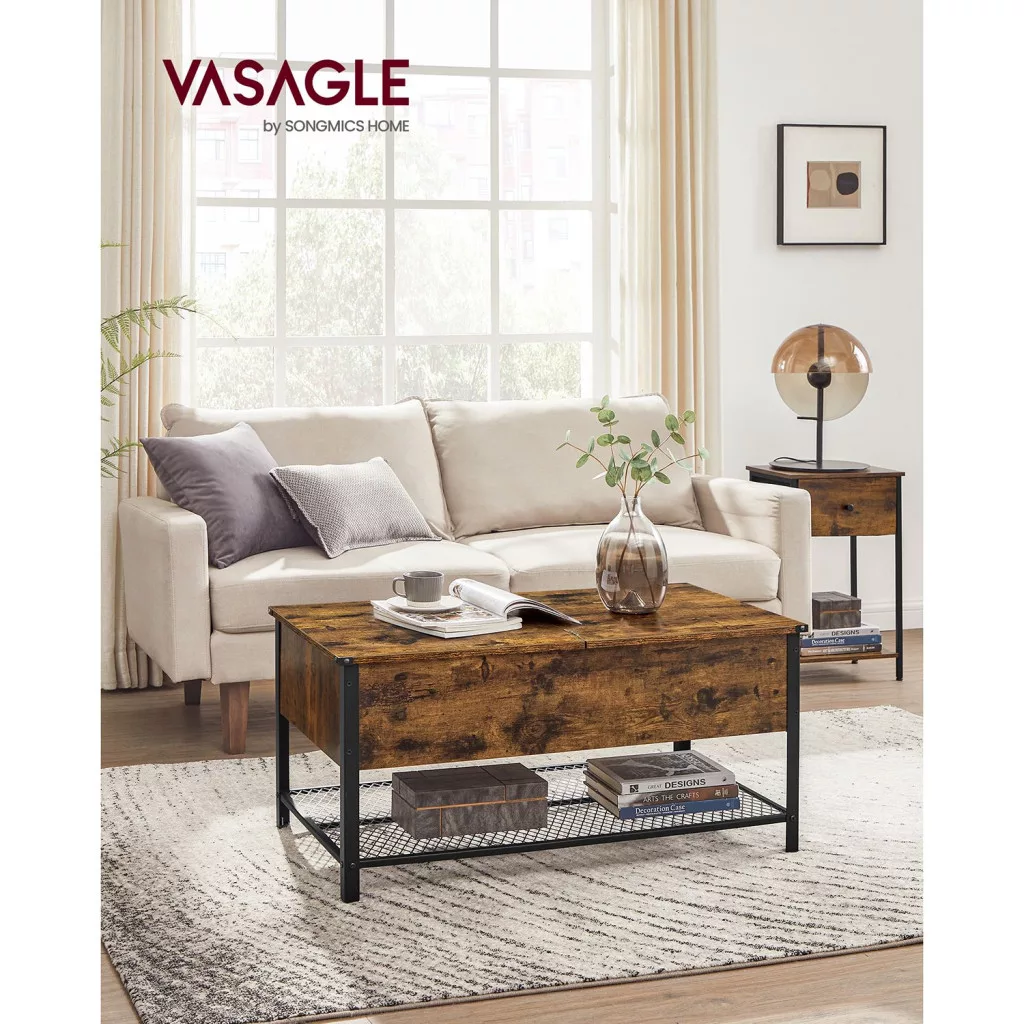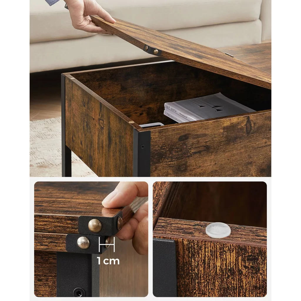 Ez a VASAGLE dohányzóasztal a modern és vintage stílus tökéletes találkozása. A rusztikus barna felület és a fekete acél váz industrial megjelenést kölcsönöz, míg a praktikus kialakítás maximális funkcionalitást biztosít. A nagy méretű asztallap alatt található rejtett tárolórekesz ideális takarók, párnák és egyéb lakberendezési kiegészítők tárolására.