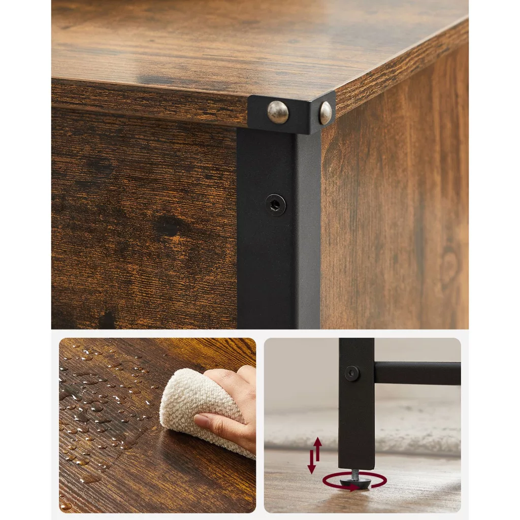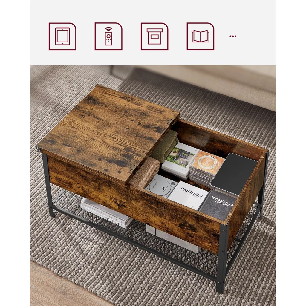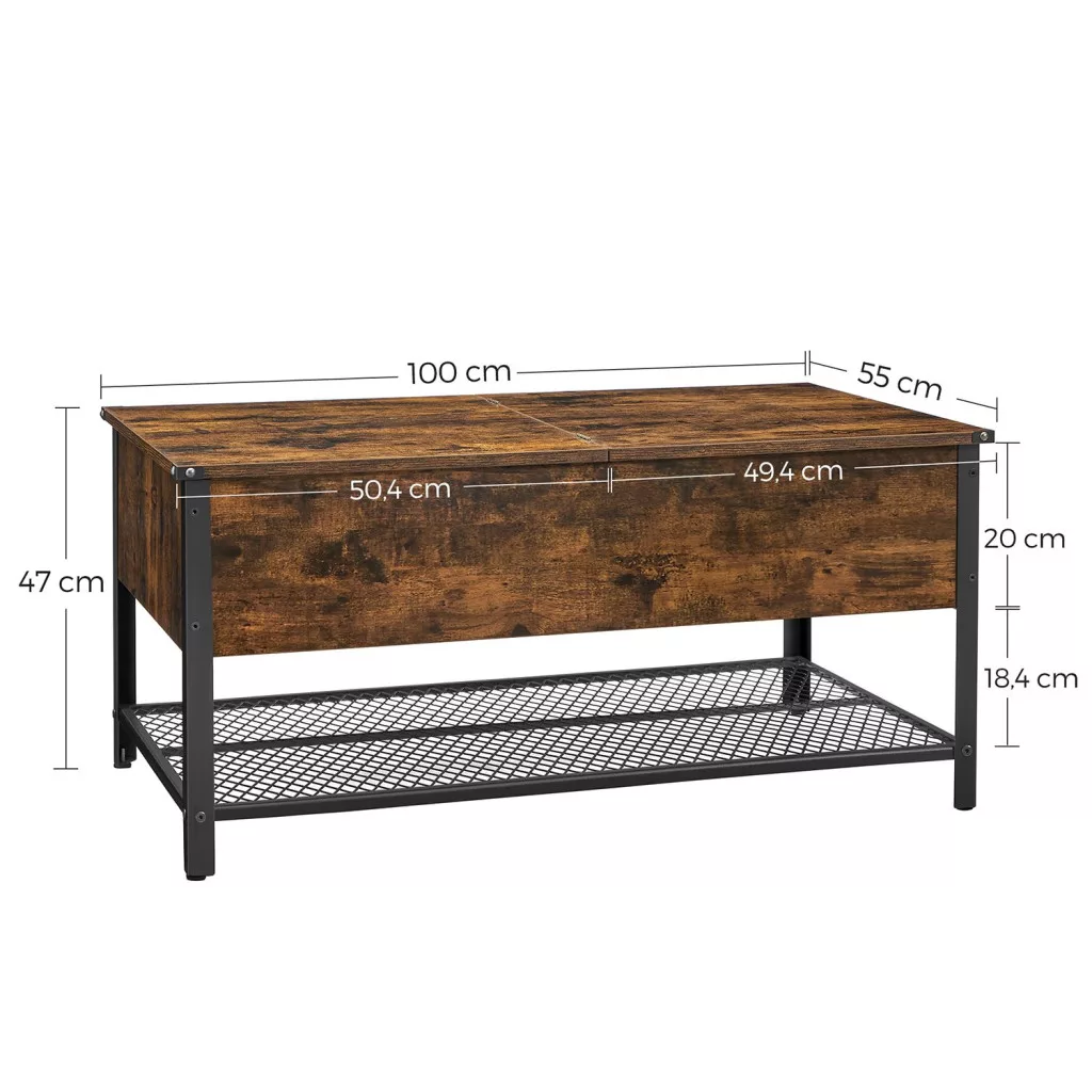 Ez a VASAGLE dohányzóasztal a modern és vintage stílus tökéletes találkozása. A rusztikus barna felület és a fekete acél váz industrial megjelenést kölcsönöz, míg a praktikus kialakítás maximális funkcionalitást biztosít. A nagy méretű asztallap alatt található rejtett tárolórekesz ideális takarók, párnák és egyéb lakberendezési kiegészítők tárolására.