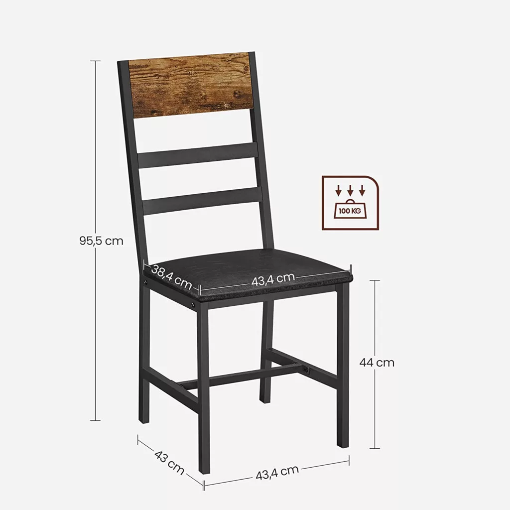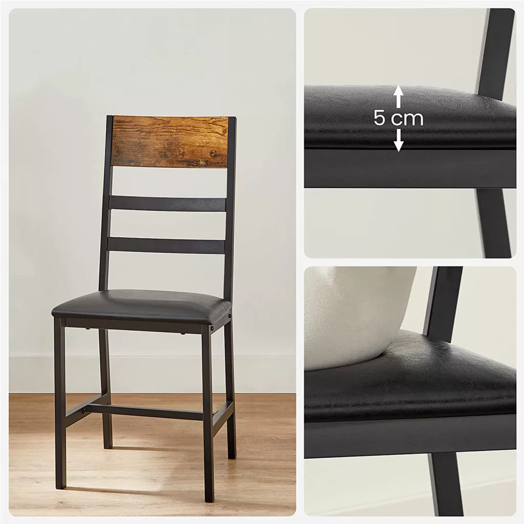 A VASAGLE étkező szék szett ötvözi a klasszikus vintage dizájnt a modern kényelemmel. A rusztikus barna háttámla és a fekete fém váz időtlen eleganciát kölcsönöz, míg az 5 cm vastag párnázott ülőfelület hosszan tartó kényelmet biztosít.