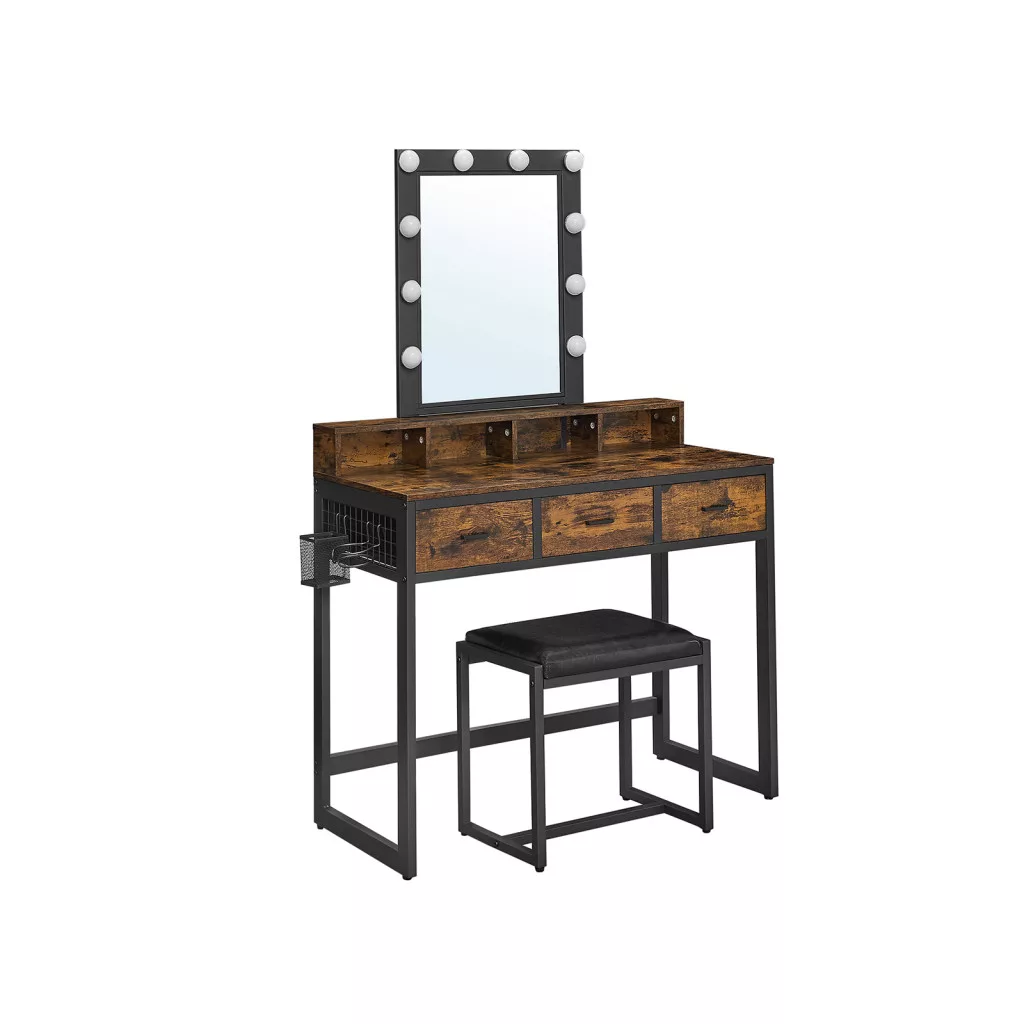 VASAGLE Vintage Fésülködőasztal LED Tükörrel és Ülőkével Ipari Stílusú Barna-Fekete