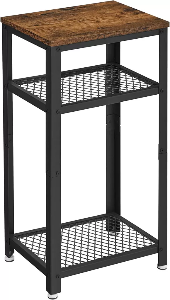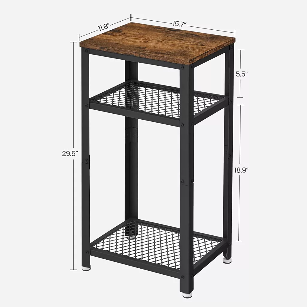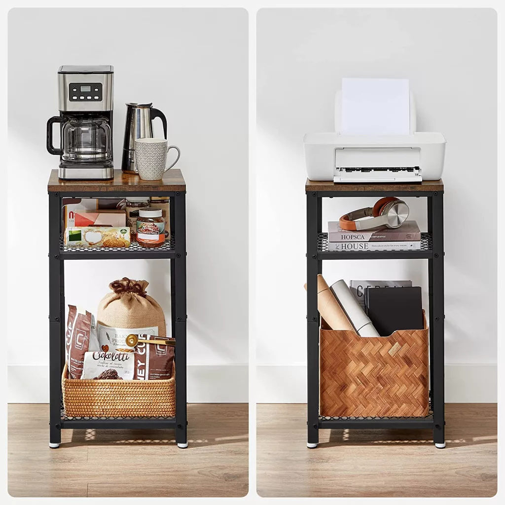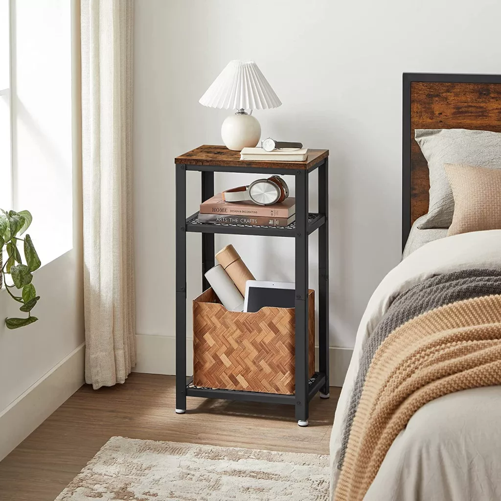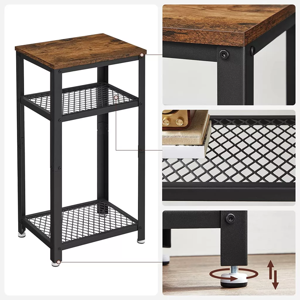 A három szintes kialakítás maximális tárolóhelyet kínál - a felső lap ideális lámpák vagy dekorációs tárgyak számára, míg az alsó hálós polcok praktikus tárolóhelyet biztosítanak magazinoknak, távirányítóknak vagy egyéb személyes tárgyaknak.