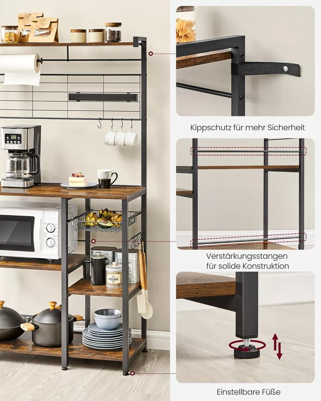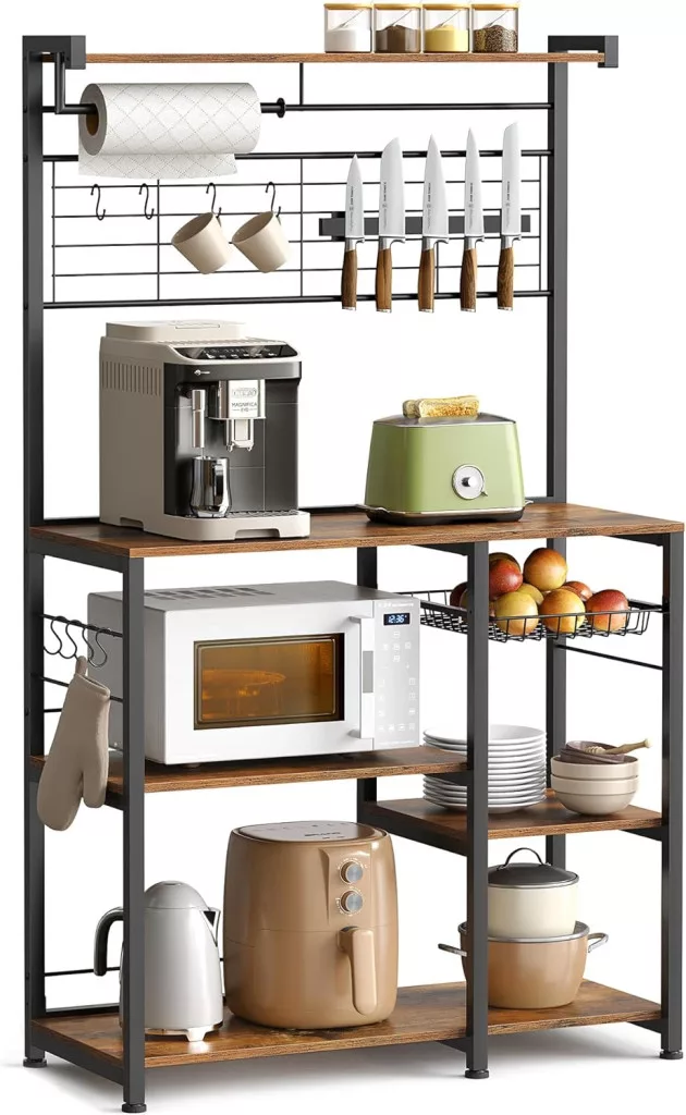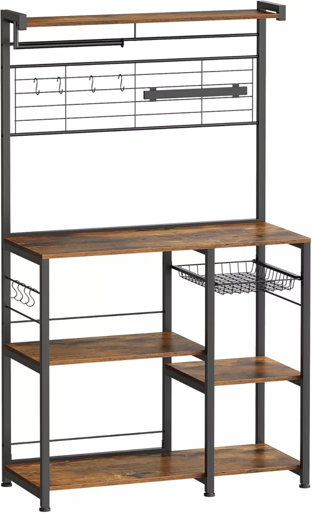 Ez a stílusos konyhai állvány ötvözi a vintage barna fa és fekete fém elemeket, hogy tökéletes egyensúlyt teremtsen a funkcionalitás és az esztétika között. A többszintes polcrendszer, a beépített mágneses késtartó és a praktikus kiegészítők lehetővé teszik a konyhai eszközök rendszerezett tárolását.
