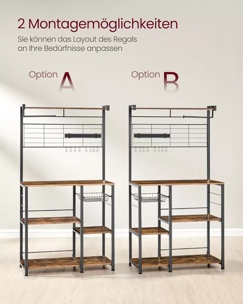 Az állvány rugalmas kialakítása két különböző szerelési opcióval rendelkezik, így személyre szabható az Ön konyhájának igényei szerint. A stabil acélváz és a minőségi faforgácslap polcok garantálják a tartósságot és a biztonságos használatot.