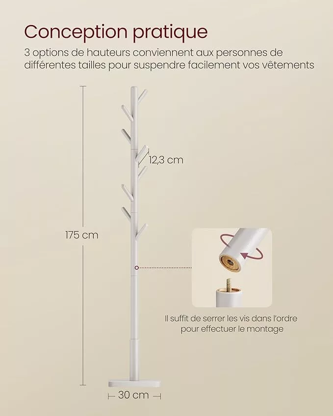 Ez a sokoldalú bútordarab nemcsak az előtérben, hanem a hálószobában, irodában vagy fogadótérben is kiválóan mutat. A 8 praktikus akasztó elegendő helyet biztosít kabátok, kalapok, sálak és táskák számára. A 3 állítható magasság lehetővé teszi, hogy a család minden tagja kényelmesen használhassa. A minimalista, letisztult design bármilyen berendezési stílushoz illeszkedik, miközben rendezett és elegáns megjelenést kölcsönöz otthonának.